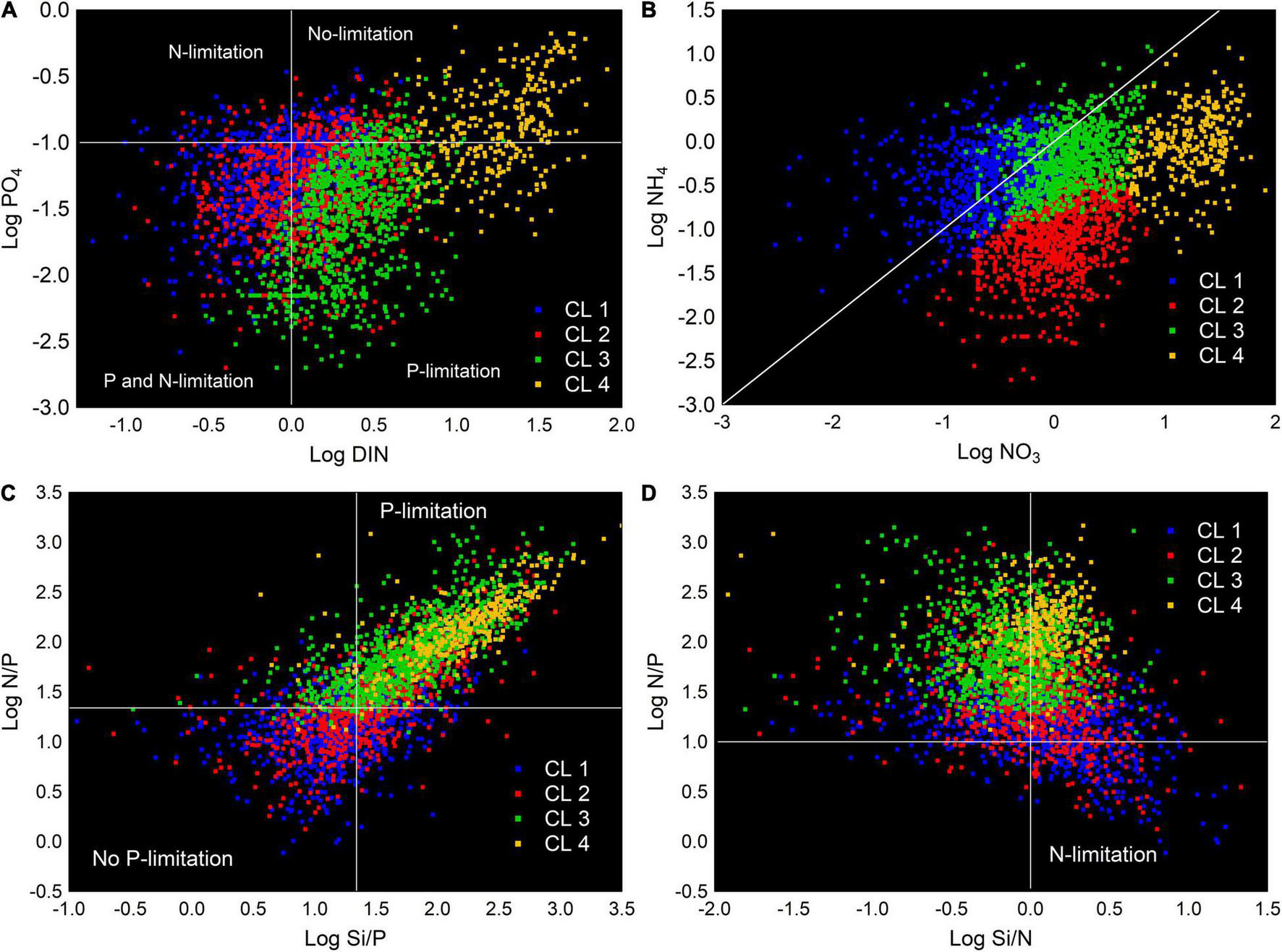 The marine environment studied is largely limited by phosphorus and partly by nitrogen (Figure 3). Nitrogen limitation is mainly present in CL 1 and CL 2, while phosphorus limitation is most pronounced in CL 3. CL 4 is characterized by maximum concentrations of nitrogen and phosphorus and is mostly not limited by nutrients (Figure 3A).