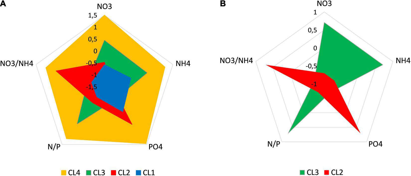 We can now summarize the main features of the clusters (Supplementary Table 2). The two clusters related to type of the marine environment and season are CL 1 and CL 4. The records collected in CL 1 are mainly from the open sea and the warmer season (see also Figure 2). This cluster is characterized by relatively low nutrient concentrations, especially nitrogen, so that the N/P ratio is relatively low. An important feature of this cluster is the dominance of regenerated over allochthonous nitrogen (low NO3–/NH4+ ratio) (Figure 4A).