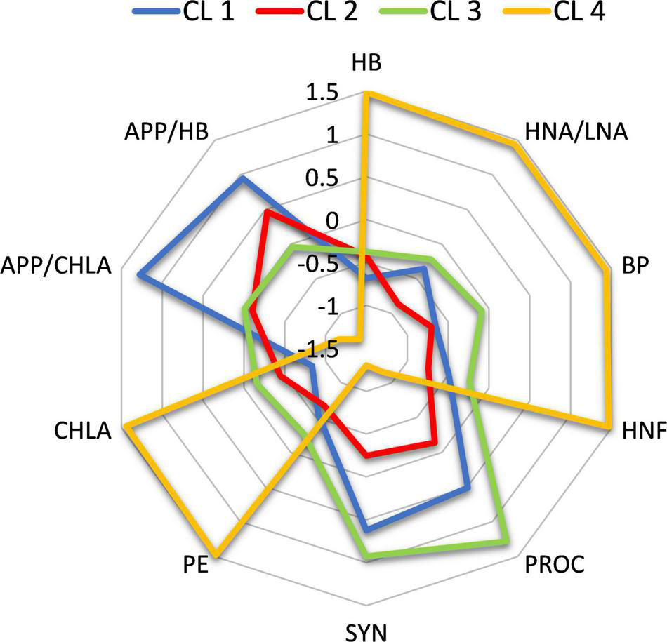 The analysis revealed different MFW structures in individual clusters (Figure 5). CL 4 is characterized by high relative values of the heterotrophic component of MFW (HB dominated by HNA bacteria, BP, HNF), while the autotrophic component of MFW was dominated by large phytoplankton (indicated by the concentration of CHLA) and the largest group of autotrophic picoplankton (PE). The relative concentrations of the prokaryotic part of the autotrophic picoplankton (cyanobacterial groups PROC and SYN) were low, and consequently the ratios APP/CHLA and APP/HB were also low.