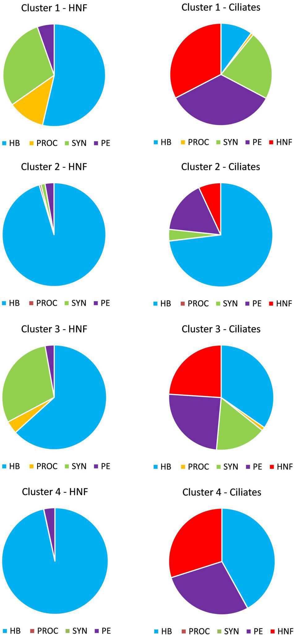 Relative proportion of prey biomass to total biomass ingested by HNF and ciliates in four clusters. HB, heterotrophic bacteria; PROC, Prochlorococcus; SYN, Synechococcus; PE, picoeukaryotes; HNF, heterotrophic nanoflagellates.