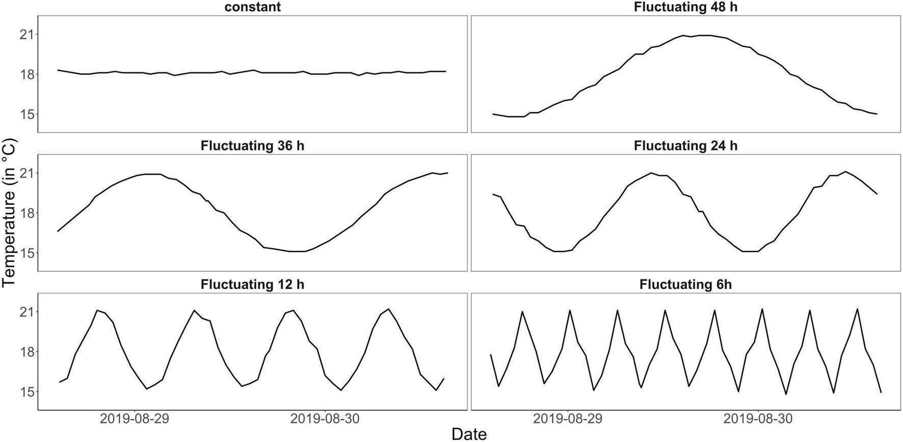 Figure 1. Measured temperature curves for the different treatments (constant control and fluctuation every 6, 12, 24, 36, and 48 h) within 50 h (data shown here for one replicate mesocosm each, from August 28 to August 30; see Supplementary Figure 1 for a complete temperature time series for each mesocosm). All treatments had the same mean temperature of 18°C and temperature fluctuations had the same amplitude of 3°C, thus were applied over the range of 15–21°C.