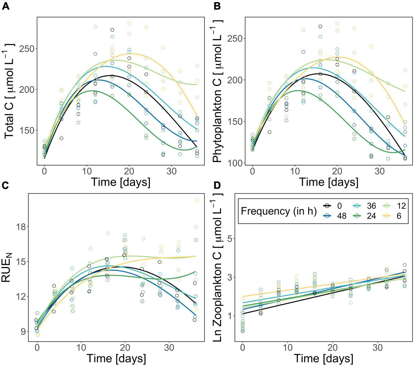 Figure 2. Total plankton biomass (carbon in μmol/L) (A), corrected phytoplankton biomass (carbon in μmol/L) (B), resource use efficiency of nitrogen (C), and ln-transformed zooplankton biomass (carbon in μmol/L) (D) during the experiment. The constant treatment is in black, fluctuation treatments are highlighted following a color gradient (dark blue fluctuation every 48 h—yellow fluctuation every 6 h). Each point represents one replicate (n = 2). Please note the different y-scales for panels (A–C). Curves/lines are loess-fits added to visualize the trend over time.