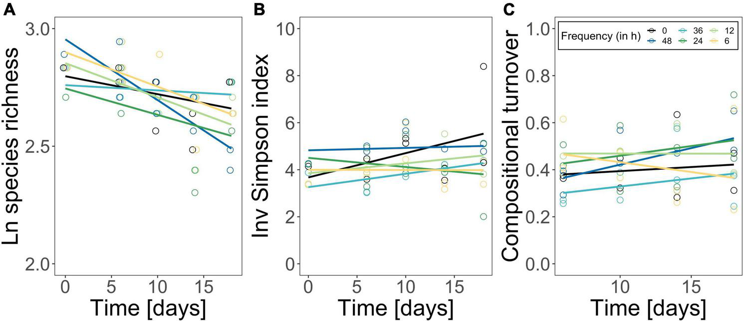 Figure 3. Logarithmized species richness (A), inverse Simpson diversity index (B) and compositional turnover (Bray-Curtis distance of phytoplankton community) (C) over time. The constant treatment is in black, fluctuation treatments are highlighted following a color gradient (dark blue fluctuation every 48 h—yellow fluctuation every 6 h). Each point represents one replicate (n = 2). Lines represent linear loess-fits added to visualize the trend over time.