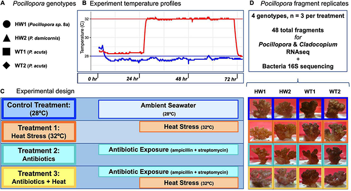 Experimental design for heat stress, antibiotics, and antibiotics-heat stress treatments. (A)Pocillopora genotypes and species identifications used in the experiment. (B) Experiment temperature profiles for control (blue) and heat stress (red) aquarium systems. (C) Experimental design indicating the intensity and duration of the control, heat stress, antibiotics, and antibiotics-heat stress treatments. (D) Fragment replicates used for downstream sequencing analyses and representative photographs of Pocillopora coral fragments from each genotype in each treatment at the time of sampling. All fragments in the control, heat stress, and antibiotics treatment appeared visually healthy, while two fragments in the antibiotics-heat stress treatment showed early signs of tissue loss.