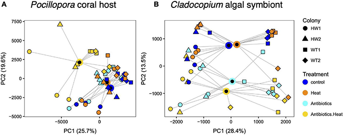 Principal coordinates analysis (PCoA) of transcriptome patterns in (A)Pocillopora corals and (B)Cladocopium algal symbionts reveals coral host cryptic species variation and experimental treatment effects, including a synergistic effect of combined antibiotics-heat treatment on coral host and algal symbiont gene expression. Point shape represents the sample colony (genotype) and color represents the treatment, with blue for the control treatment, orange for the heat treatment, cyan for the antibiotics treatment, and yellow for the combined treatment. Treatment centroids are plotted as black circles outlined in each treatment color with lines connected to each sample within the treatment.