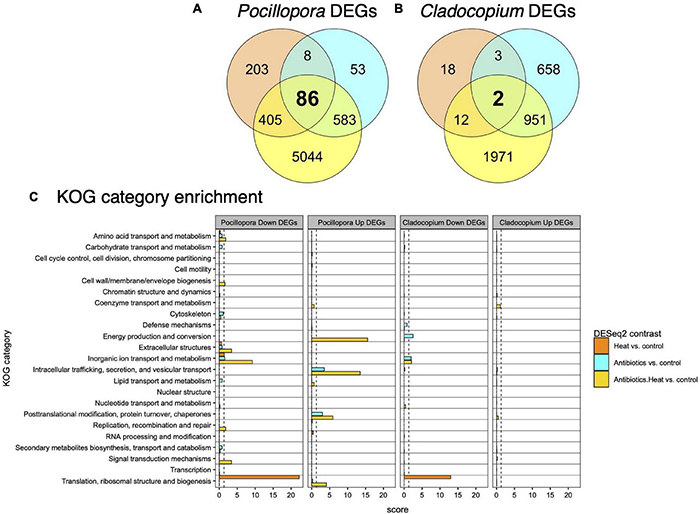 Enrichment analysis of the Pocillopora and Cladocopium DEGs detected in treatment contrasts that had annotations to 23 non-overlapping KOG categories revealed distinct biological responses to the heat stress, antibiotics, and antibiotics-heat stress treatments (Figure 3C).