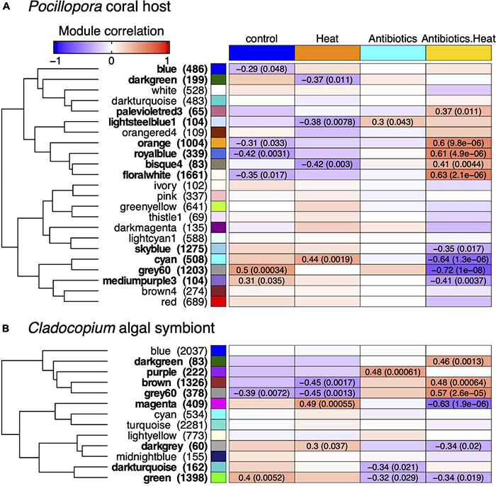For Pocillopora, there were 2 positively (‘grey60’ and ‘mediumpurple3’) and 4 negatively (‘royalblue,’ ‘floralwhite,’ ‘orange,’ and ‘blue’) correlated modules to the control treatment, 1 positively (‘cyan’) and 3 negatively (‘bisque4,’ ‘lightsteelblue1,’ and ‘darkgreen’) correlated modules to the heat stress treatment, 1 module positively correlated to the antibiotics treatment (‘lightsteelblue1’), and 5 positively (‘floralwhite,’ ‘royalblue,’ ‘orange,’ ‘bisque4,’ and ‘palevioletred3’) and 4 negatively (‘grey60,’ ‘cyan,’ ‘mediumpurple3,’ and ‘skyblue’) correlated modules to the antibiotics-heat stress treatment (Figure 4A).