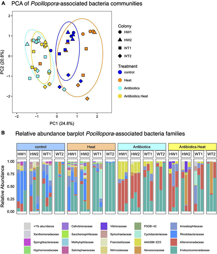 Bacteria 16S sequencing demonstrates that antibiotics treatments alter coral-associated bacteria communities, and that certain coral-associated bacteria families exhibit differential susceptibility to antibiotics treatment. (A) Principal components analysis (PCA) plot of coral-associated bacteria communities reveals that antibiotics-treated samples (yellow and cyan) cluster separately from heat stress and control treatment samples (blue and orange). Point shape represents the sample colony (genotype) and color represents the treatment, with blue for the control treatment, orange for the heat treatment, cyan for the antibiotics treatment, and yellow for the combined treatment. Colored ellipses represent the 95% confidence interval. (B) Barplot of the relative abundance of bacteria families in each treatment reveals significant declines in the abundance of coral-associated Rhodobacteraceae bacteria (royal blue) and increases in Alteromonadaceae bacteria (red) in antibiotics-treated corals, while Endozoicomonadaceae bacteria (dark green) tend to dominate both WT genotypes and are not eliminated by antibiotics treatment.