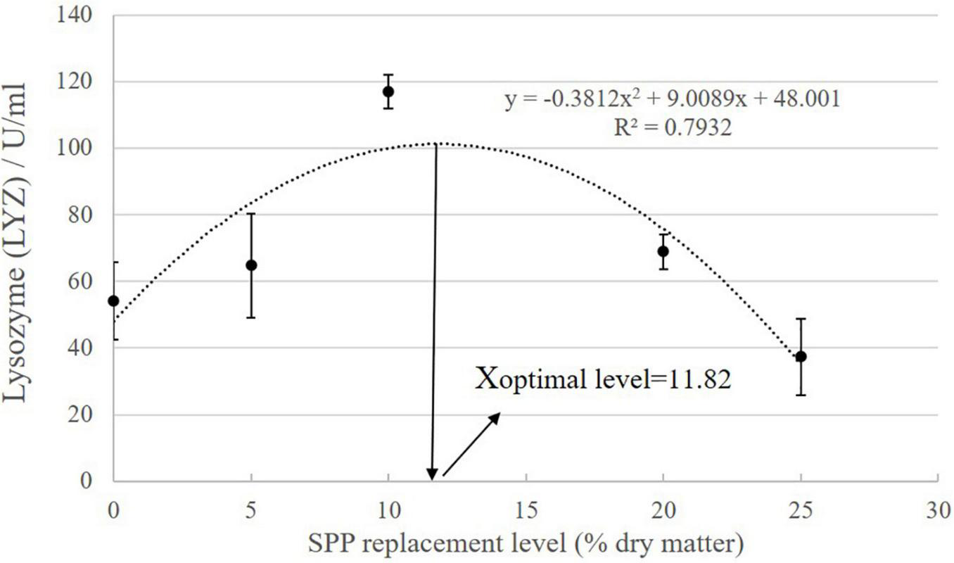 Based on the broken-line regression analysis model of LYZ activity in serum, the SPP optimal replacement level for juvenile pompano Trachinotusovatus is 12.80%.