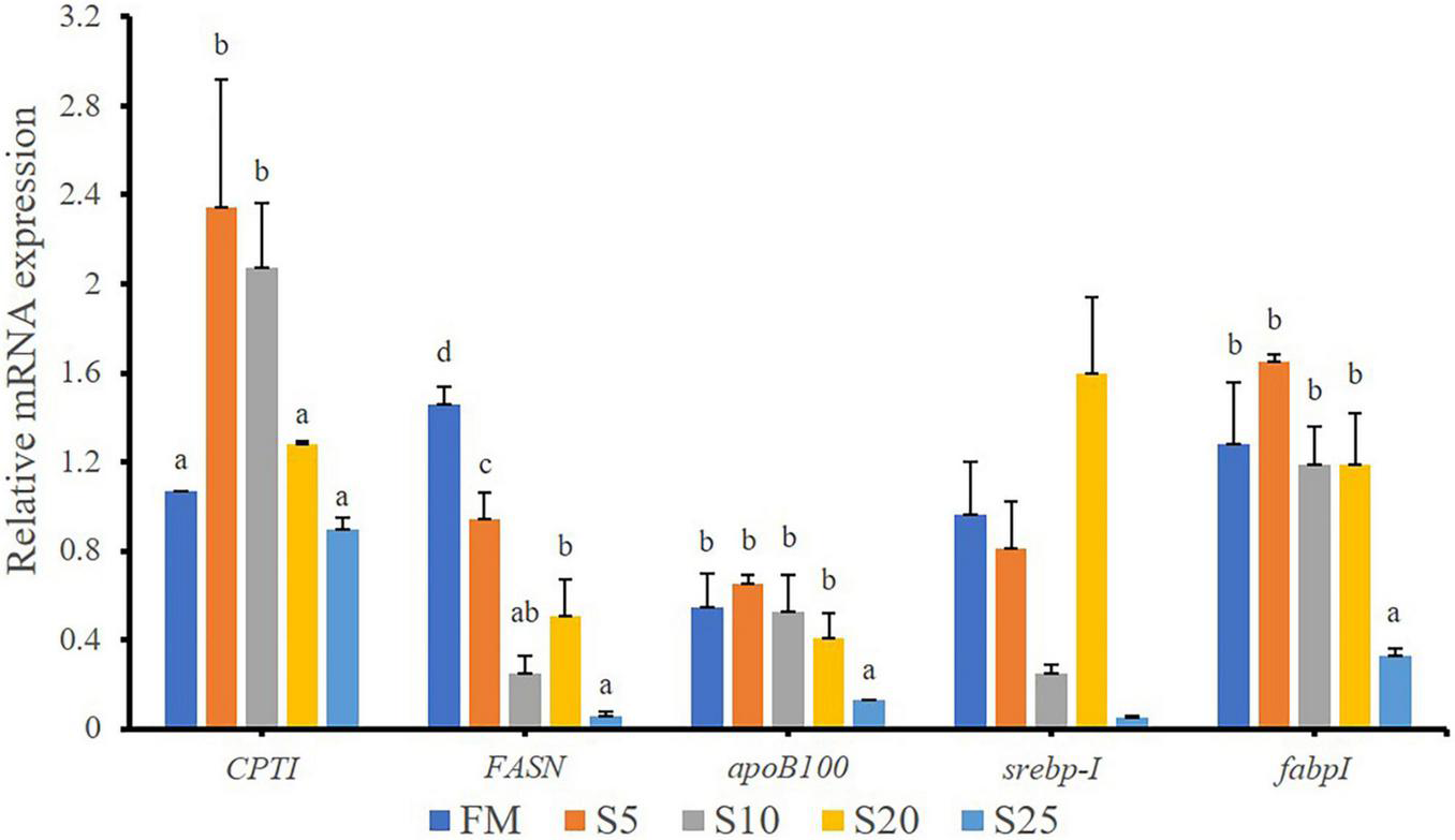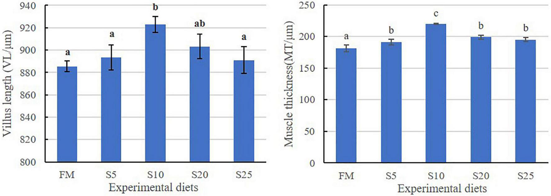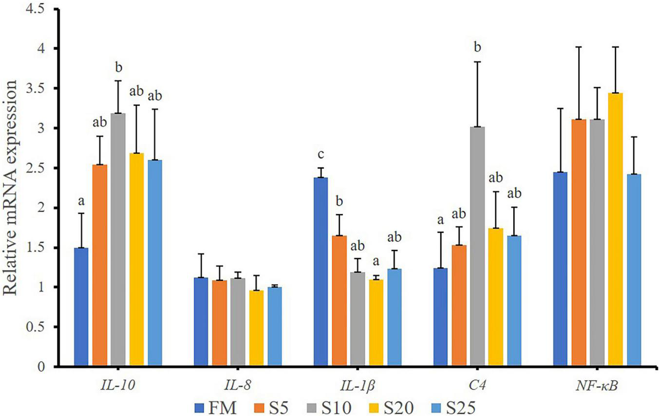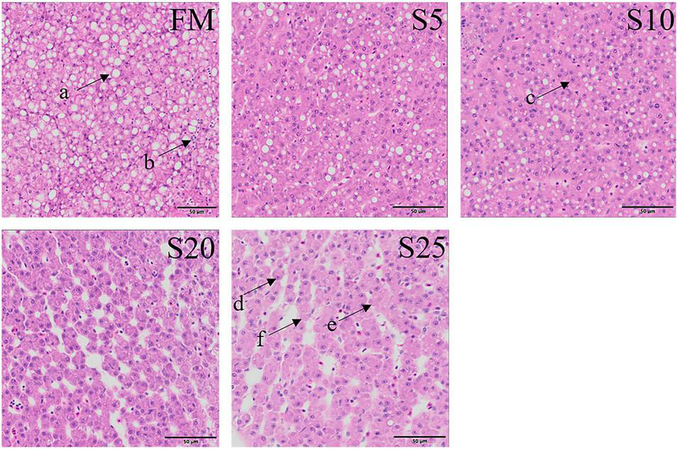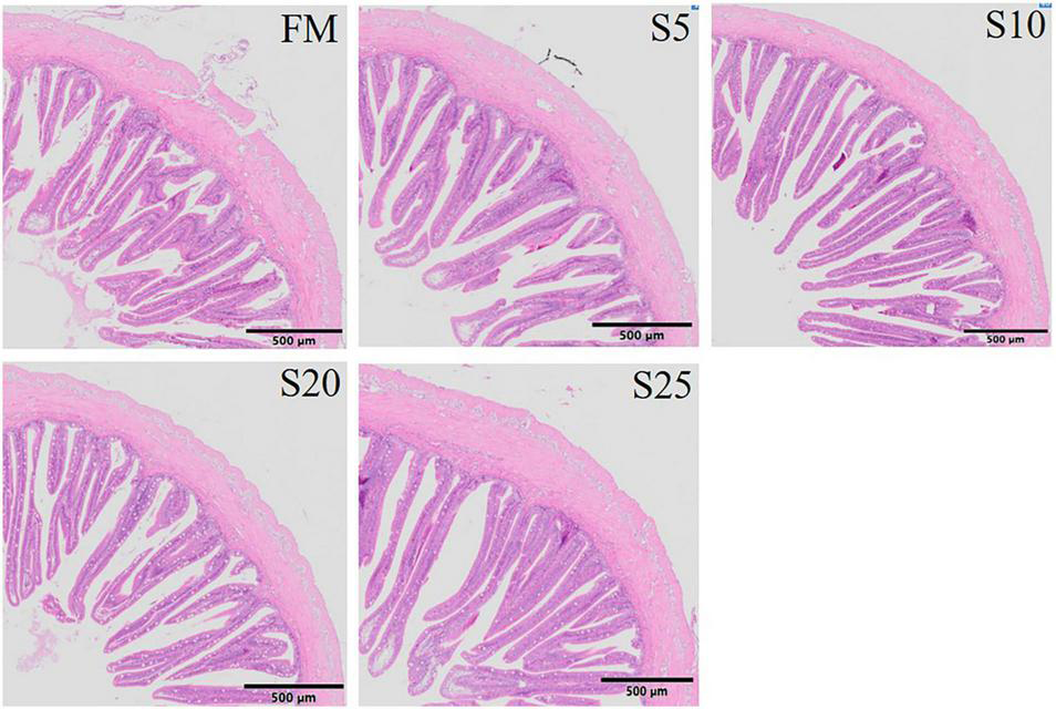 The experimental diet was formulated to provide 41.00% of crude protein (Table 1), and the dietary amino acid composition was shown (Table 2). The proximate compositions and amino acid composition of FM and SPP used in this study were presented in Table 3. The proportion of SPP with a relative molecular mass of less than 1,000 Da was 100%, provided by Yisheng Biotechnology Company (Yangjiang, Guangdong, China). Five iso-nitrogenous and iso-lipidic experiment diets were formulated to contain 0, 5.45, 10.90, 21.78, and 27.23% of SPP by replacing 0, 14.29, 28.57, 57.14, and 71.42% of FM, respectively. Reduction in feed by 0% (FM, control group), 5% (S5), 10% (S10), 20% (S20), and 25% (S25) FM, respectively. FM and soybean meal were the main sources of protein in the diet. Fish oil, soybean oil, and soybean lecithin oil were the lipid sources.