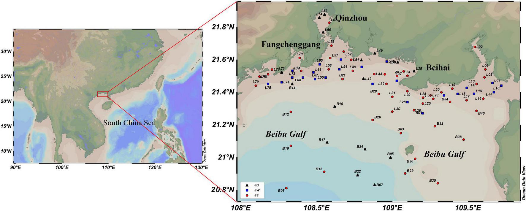 Location of Beibu Gulf and sampling station distribution. L stations were sampled during L cruise, while B stations were sampled during B cruise. SD, sediment station, SW, seawater station, SS, sediment and seawater station.