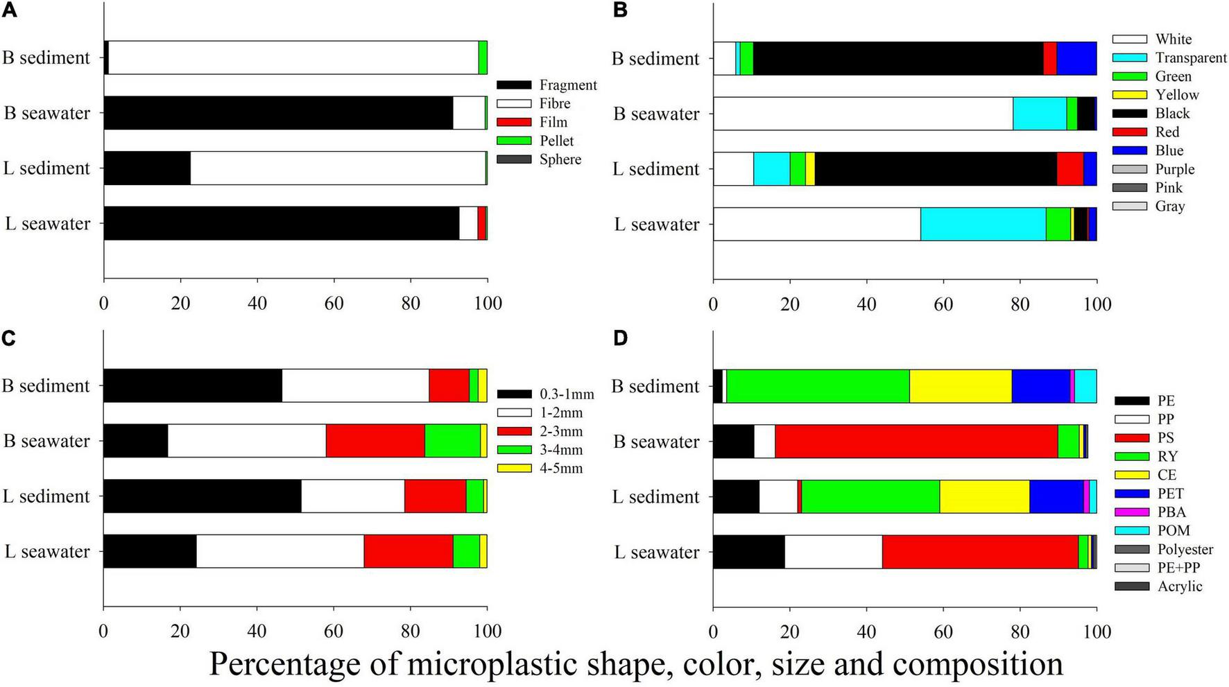 The size compositions of microplastics in sediment are shown in Figure 2C. In both L and B stations, microplastics with a diameter of 1–2 mm were the dominant, accounted for 43.8% and 41.3%, respectively, followed by 0–1 mm (24.2%), 2–3 mm (23.2%), 3–4 mm (6.9%), and 4–5 mm (2.2%) in L stations, and 2–3 mm (25.7%), 0–1 mm (16.7%), 3–4 mm (14.5%), and 4–5 mm (2.8%) in B stations.