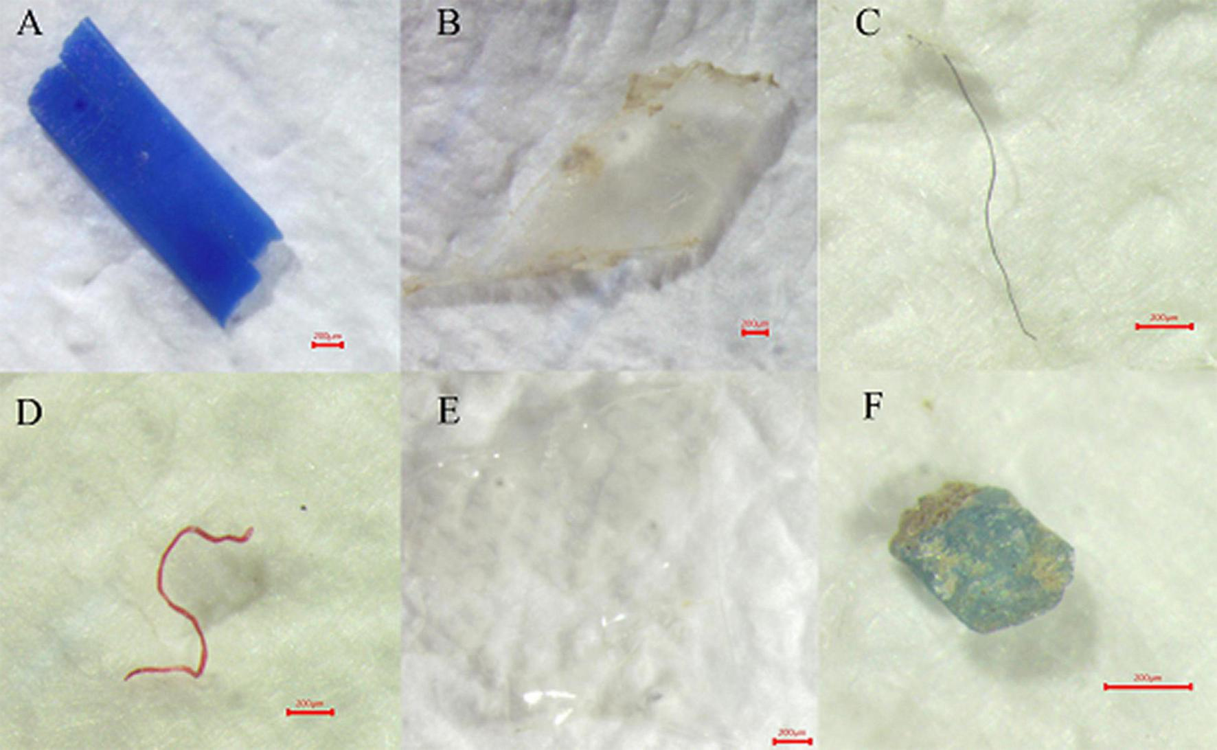 Selected microplastic shapes inspected by SteREO microscope: fragment (A,B), fiber (C,D), film (E), and pellet (F).