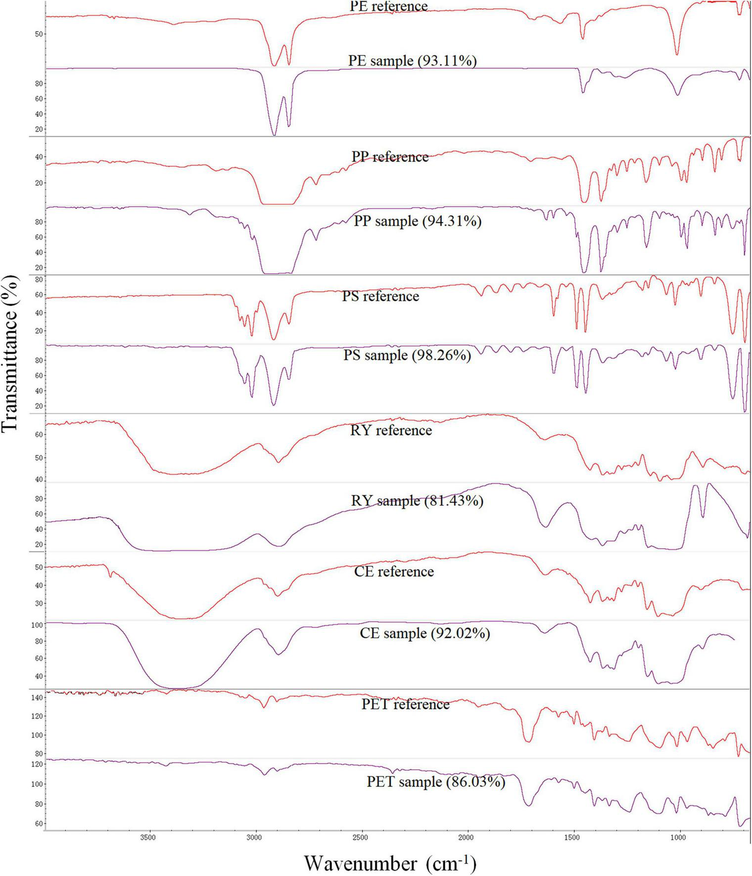 Typical polymer μ-FTIR spectra are shown in Figure 4. To identify the synthetic polymer, a relatively higher matching degree (>75%) was set to provide more accurate results. There was little shift of the main polymer absorption band according to the comparisons (Chen et al., 2018; Li Y. et al., 2020). Eleven polymers were detected in seawater samples, including polyethylene (PE), polypropylene (PP), PS, rayon (RY), cellulose (CE), polyethylene terephthalate (PET), polyester, polybutylene adipate glycol (PBA), polyoxymethylene (POM), and acrylic. The proportion of each polymer type in seawater is shown in Figure 2D. The main polymers in coastal seawater (L stations) were PS (51.1%), PP (25%), PE (18.6%), and RY (2.5%), while in far coastal areas (B stations), they were PS (73.7%), PE (10.6%), PP and RY (5.6%), and CE (1.1%).