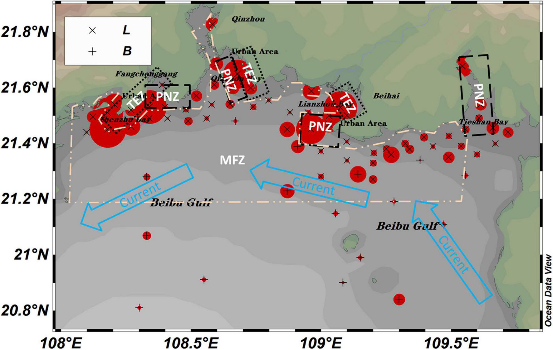 Distributions of microplastics in seawater from L and B stations. MFZ, Mariculture and Fishery Zone; TEZ, Tourism and Entertainment Zone; PNZ, Port and Navigation Zone.