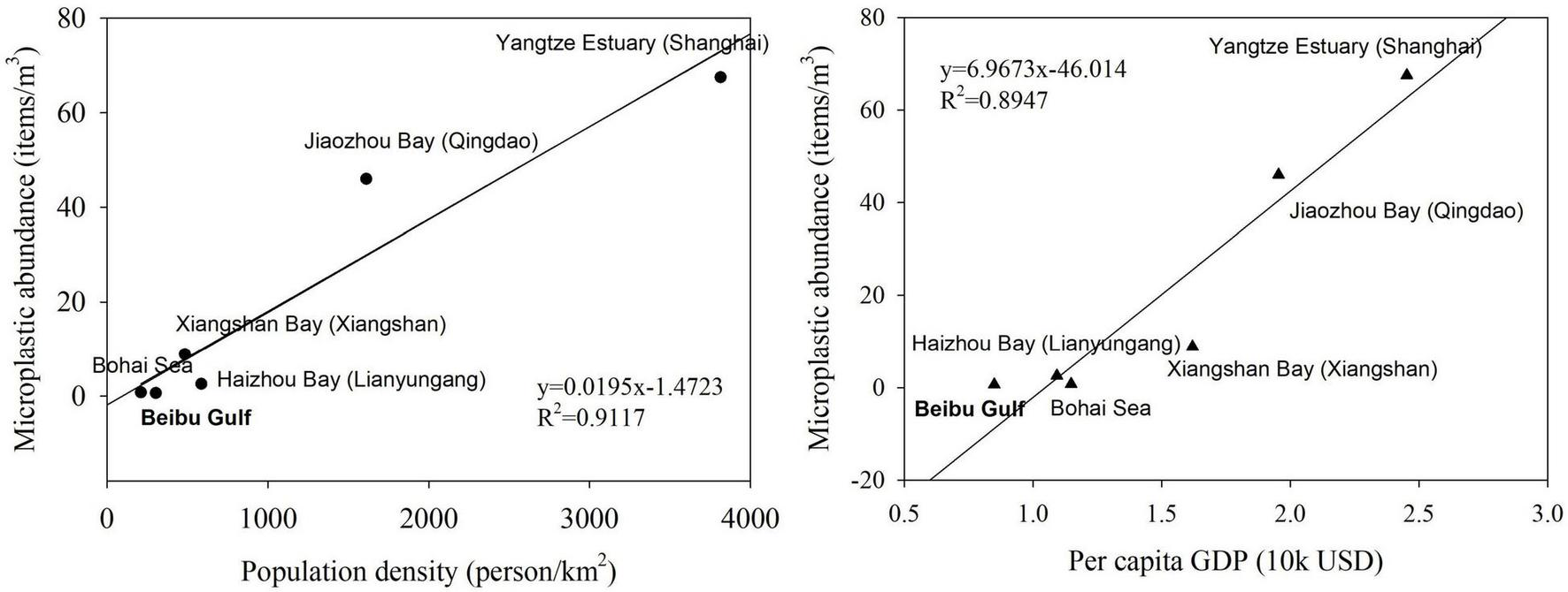 At the same time, though Beibu Gulf is experiencing the economic development and rapid urbanization of the surrounded human land, still it is one of the least developed regions among the coastal areas of China, with per capita gross domestic product (GDP) of USD 8.56k, while for whole China is USD 11.3k (2020). The microplastic pollution should be at a low level according to the positive relationships found between microplastic abundance and factors, such as land use percentages (Kataoka et al., 2019), population density (Yonkos et al., 2014), and GDP (Fan et al., 2019) in some water bodies. However, the Beibu Gulf is also a microcosm of the fishery industry of China and Southeast Asian countries and fishery is one of the pillar industries. Therefore, the Beibu Gulf is a typical area to study the co-influence of socioeconomics and fishery industry to the microplastic pollution, understanding the status of microplastics in Beibu Gulf is helpful in taking measures and policymaking to reduce microplastics in China and Southeast Asian countries (Xue et al., 2020).