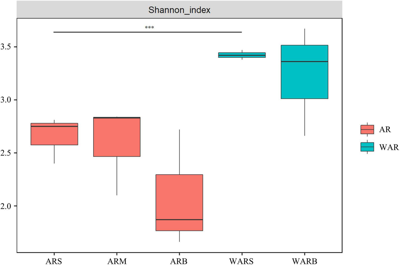 Shannon diversity index. Shannon diversity index of the upper, middle and bottom layers of the ARs (ARS, ARM, and ARB). Shannon diversity index of the surface WAR and bottom WAR (WARS and WARB, respectively). Comparing the samples at both ends of the line, *** indicates an extremely significant difference.