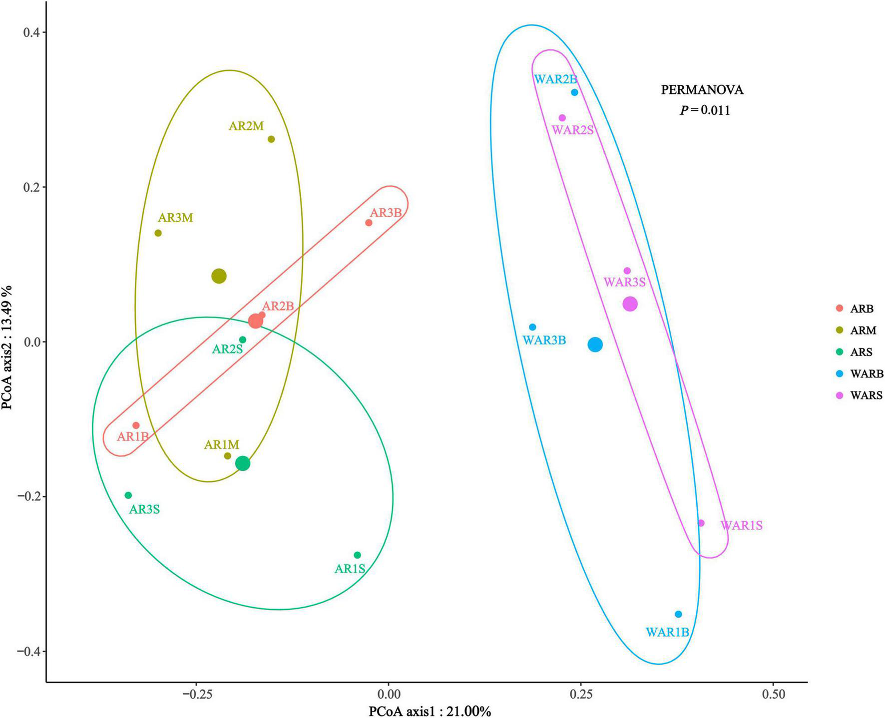 The main purpose of β-diversity analysis was to determine the differences in the structure of the protist community between different sampling locations. Combined PCoA and permutational multivariate analysis of variance (PERMANOVA) (Figure 4) revealed that the distance between the ARs and the WAR was relatively far, indicating a significant difference in the structure of protist communities between the ARs and the WAR (P = 0.011). At different sampling locations on the ARs, the ARM and ARB were relatively close, and the centroid of the ARS was below the horizontal axis, which differs from the patterns observed for the other two groups.