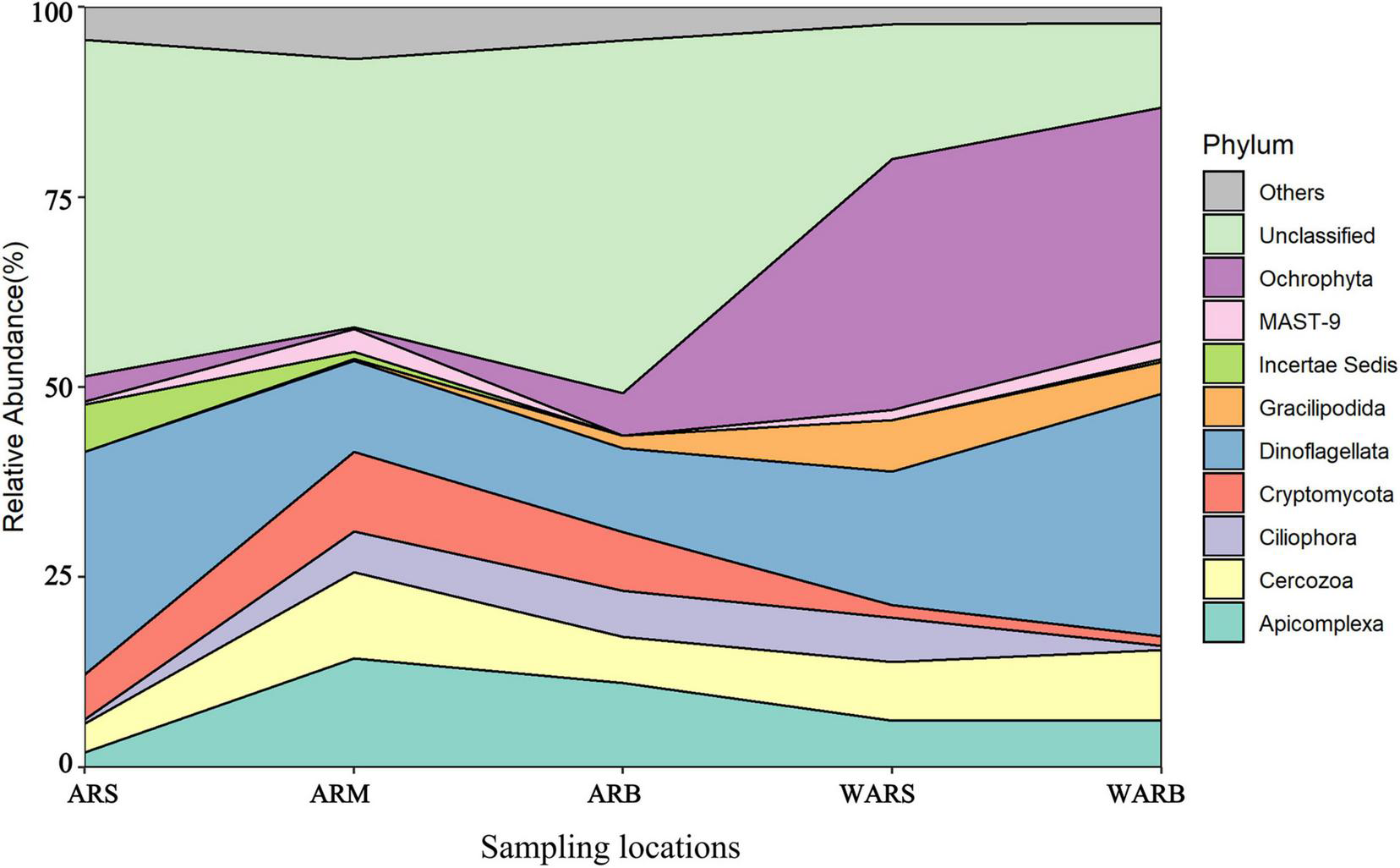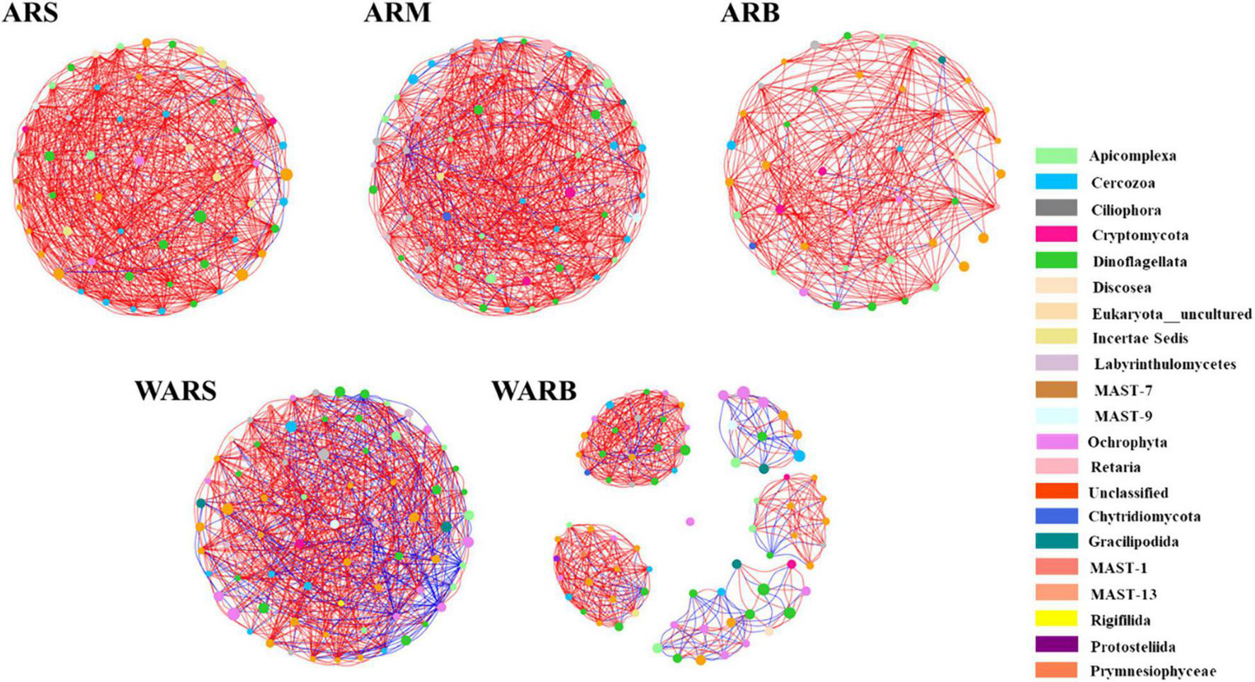 Although the shared phyla occupied more network nodes and showed a greater abundance, their importance in the group was not significant. Average closeness centrality reflects the closeness between a node and other nodes in a network. The closer a node is to other nodes, the greater the proximity centrality and the more important it is. The top 6 phyla and their abundances in each network based on the average closeness centrality are listed in Supplementary Table 2. The data showed that the phyla with lower abundances in the ARS, ARM, and ARB networks had higher average closeness centrality, which meant that they were more critical in the protist community. This phenomenon was not observed in the WAR networks, especially WARS. Unclassified and Ochrophyta with higher abundances had higher average closeness centrality. In addition, the phyla with high average closeness centrality in the WAR networks did not correspond to the key phyla in the protist community of ARs. For example, the AR co-occurrence networks showed that Labyrinthulomycetes was a key phylum, but its average closeness centrality was small or it did not appear in the WAR networks. Ochrophyta had the highest average closeness centrality in the WARB network, but it was not critical in each layer of the ARs.