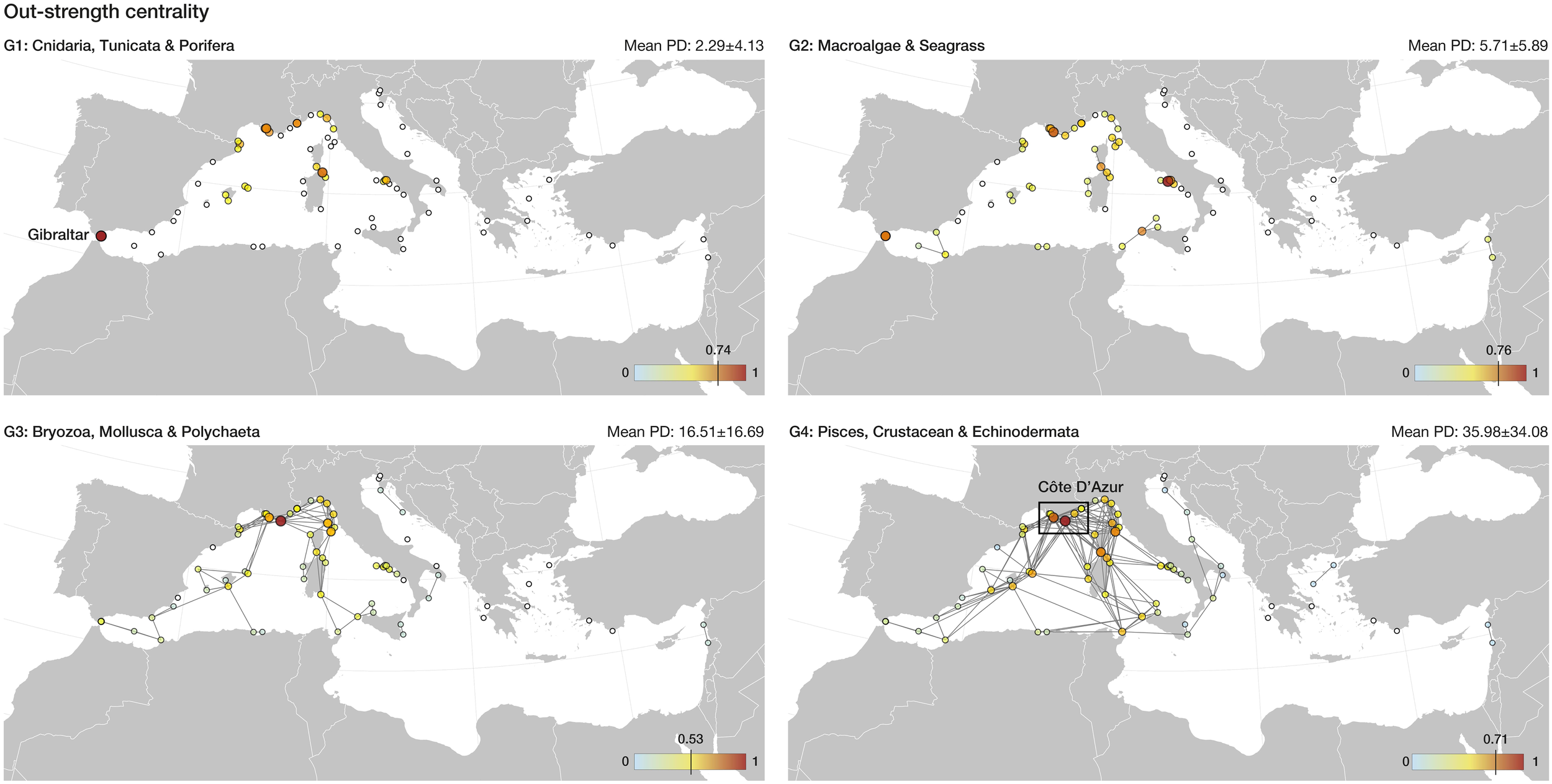 Graph theory using pairwise connectivity estimates showed that 19 out of 70 reserves (~27%) play a key role towards the functioning of the network (above 95th percentile of Betweenness or Out-strength), acting as stepping-stones, propagule source areas or both, for one or more ecological groups (Table 1). The marine reserves with the highest Betweenness centrality, contributing for stepping-stone connectivity, are spread throughout the Ligurian and Tyrrhenian Seas for the low dispersive groups G1 and G2, which in general display poor network connectivity (Table 1; Figure 1). As the network expands with increasing PD, new links are formed and the reserves with highest Betweenness centrality are found in the Balearic Islands and the Ionian Sea. Particularly, the Plemmirio and Capo Rizzuto reserves play an important role for G4 (Table 1), supporting stepping-stone connectivity between the western and eastern Mediterranean basins (Figure 1). The marine reserves with the highest Out-Strength centrality (Table 1; Figure 2), are located in Gibraltar and the Ligurian and Tyrrhenian Seas for G1 and G2. For G3 and G4, highest Out-Strength centrality was found in the Ligurian Sea, particularly in the Côte D’Azur area (Calanques, Port Cros and Cote Bleue reserves; Table 1), where the network of reserves is denser and therefore more connectivity events occurred (Table 1; Figure 2).