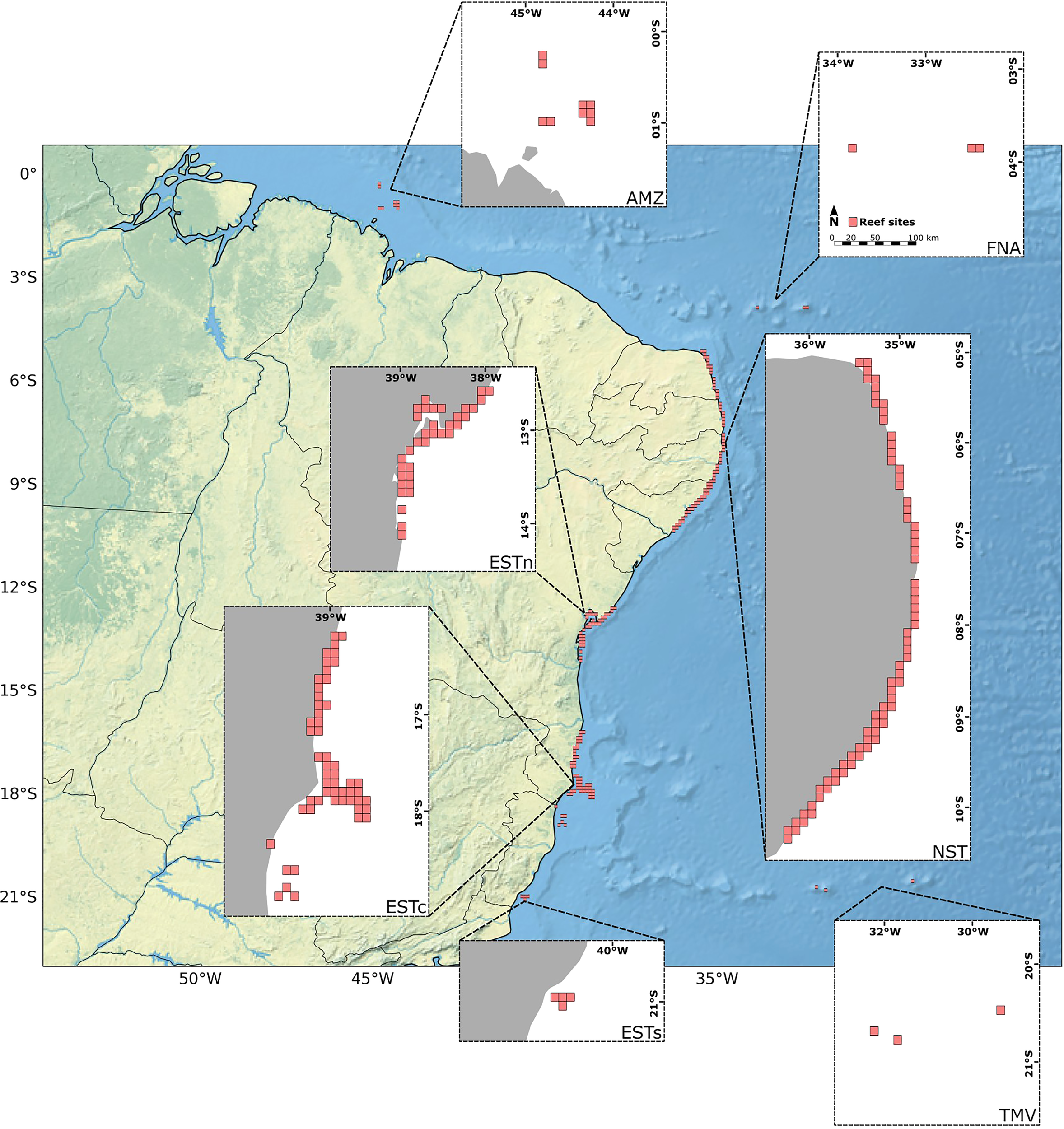The study area was delimited between latitudes 1°N–22.5°S, according to the geographic distribution of shallow water coral reefs on the BCM (UNEP-WCMC et al., 2018; Magris et al., 2021). This area was divided into seven regions, adapted from the marine ecoregions proposed by Spalding et al. (2007): (i) Amazon – AMZ, encompassing mainly the Parcel de Manuel Luís reefs; (ii) Fernando de Noronha-Atol das Rocas – FNA; (iii) Northeastern coast – NST; (iv) Eastern-north – ESTn, encompassing the reefs along the Baía de Todos os Santos and adjacent areas; (v) Eastern-center – ESTc, corresponding to the formations along the Abrolhos and Royal Charlotte banks; (vi) Eastern-south – ESTs, encompassing mainly the reefs near Guarapari; (vii) Trindade-Martim Vaz Islands – TMV, associated with isolated reef formations that extend to the end of the Vitória-Trindade Chain, from Mount Columbia to Trindade Island (Figure 1).