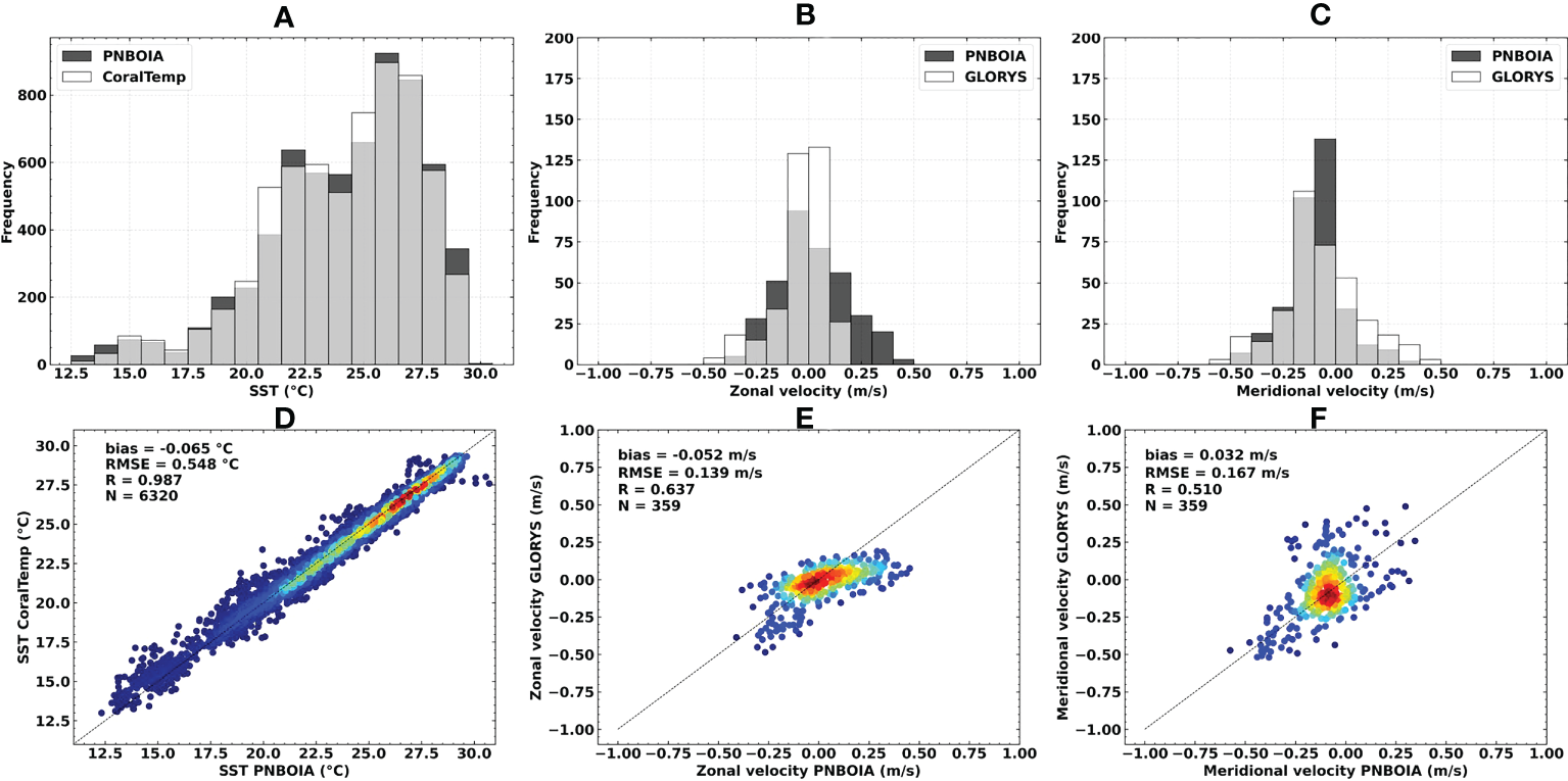 Sea surface temperature, zonal and meridional surface current velocities statistical comparisons in relation to in situ PNBOIA measurements: (A, D) CoralTemp SST (°C); (B, E) GLORYS12V1 ocean currents zonal velocity (m/s); (C, F) GLORYS12V1 ocean currents meridional velocity (m/s). N = number of observations. Warmer colors indicate higher data densities.