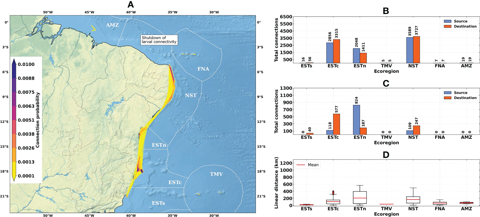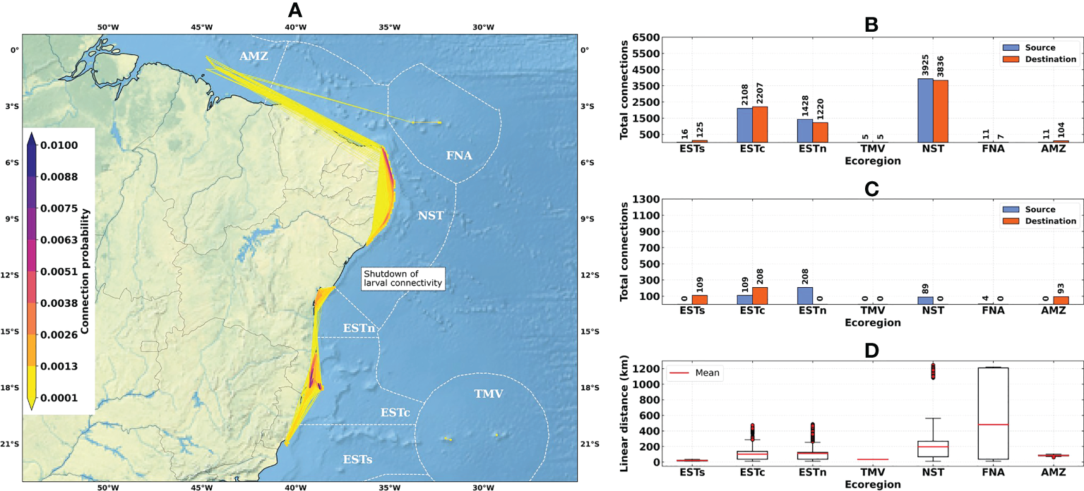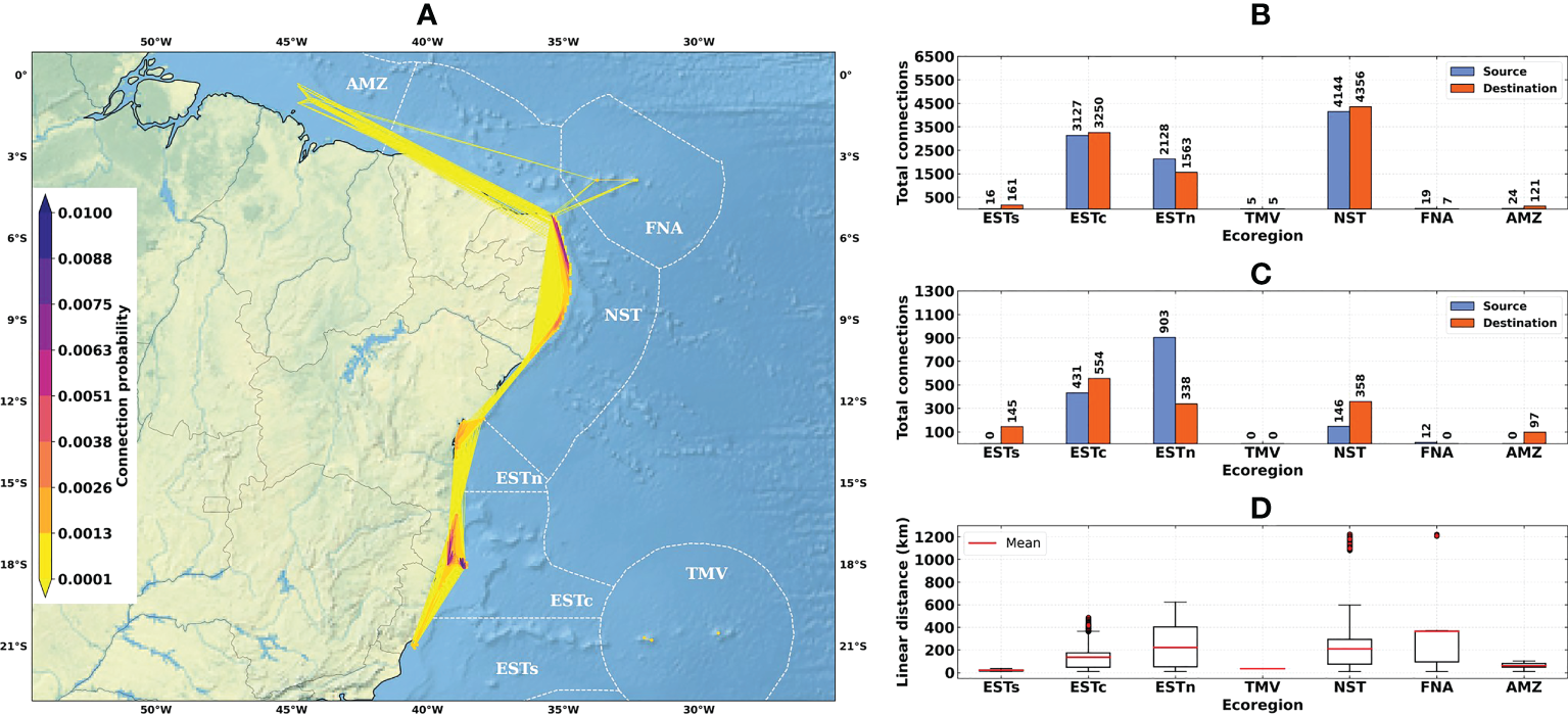 Connectivity patterns obtained from the larval connectivity model, considering the average of dispersal simulations between August–September–October for the La Niña years (1998–1999 and 2010–2011): (A) Distribution of connection probabilities between reef sites; (B) Total number of connections given source (in blue) and destination (in orange) ecoregions; (C) Number of connections given source (in blue) and destination (in orange) ecoregions, disregarding connections between reef sites within the same ecoregion; (D) Linear distances from connections between the source and destination reef sites. Ecoregions: Eastern-south (ESTs); Eastern-center (ESTc); Eastern-north (ESTn); Northeastern (NST), Amazon (AMZ), Fernando de Noronha-Atol das Rocas (FNA), Trindade-Martim Vaz Islands (TMV).