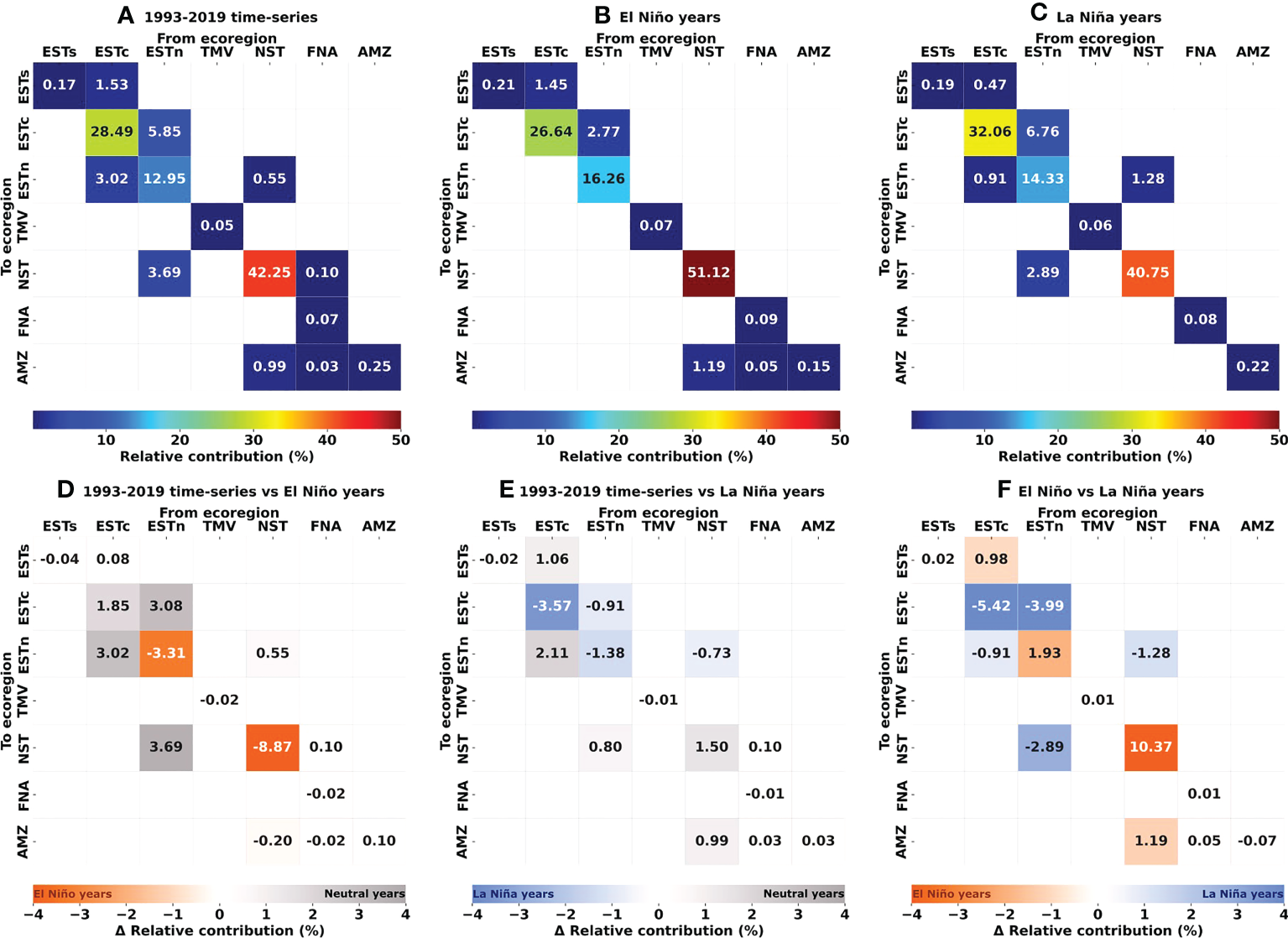 Connectivity and delta matrices showing the relative contribution (%) of source and destination ecoregions in larval dispersal, i.e, weighted number of reef sites connections per probability. (A) 1993–2019 time-series; (B) El Niño years (1997–1998 and 2015–2016); (C) La Niña years (1998–1999 and 2010–2011); (D) 1993–2019 time-series minus El Niño years; (E) 1993–2019 time-series minus La Niña years; (F) El Niño minus La Niña years. In (D–F), gray/blue/orange values indicate higher contribution during Neutral/El Niño/La Niña years, respectively. Ecoregions: Eastern-south (ESTs); Eastern-center (ESTc); Eastern-north (ESTn); Northeastern (NST), Amazon (AMZ), Fernando de Noronha-Atol das Rocas (FNA), Trindade-Martim Vaz Islands (TMV).