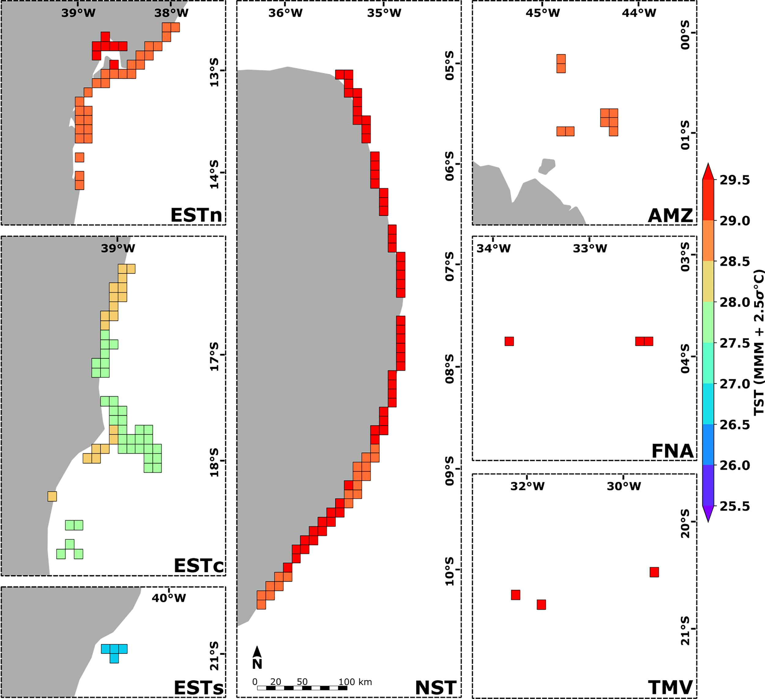 Spatial distribution of thermal stress thresholds (TST) calculated for the 180 reef sites along the Brazilian continental margin (in gray). Ecoregions: Eastern-south (ESTs); Eastern-center (ESTc); Eastern-north (ESTn); Northeastern (NST), Amazon (AMZ), Fernando de Noronha-Atol das Rocas (FNA), Trindade-Martim Vaz Islands (TMV).