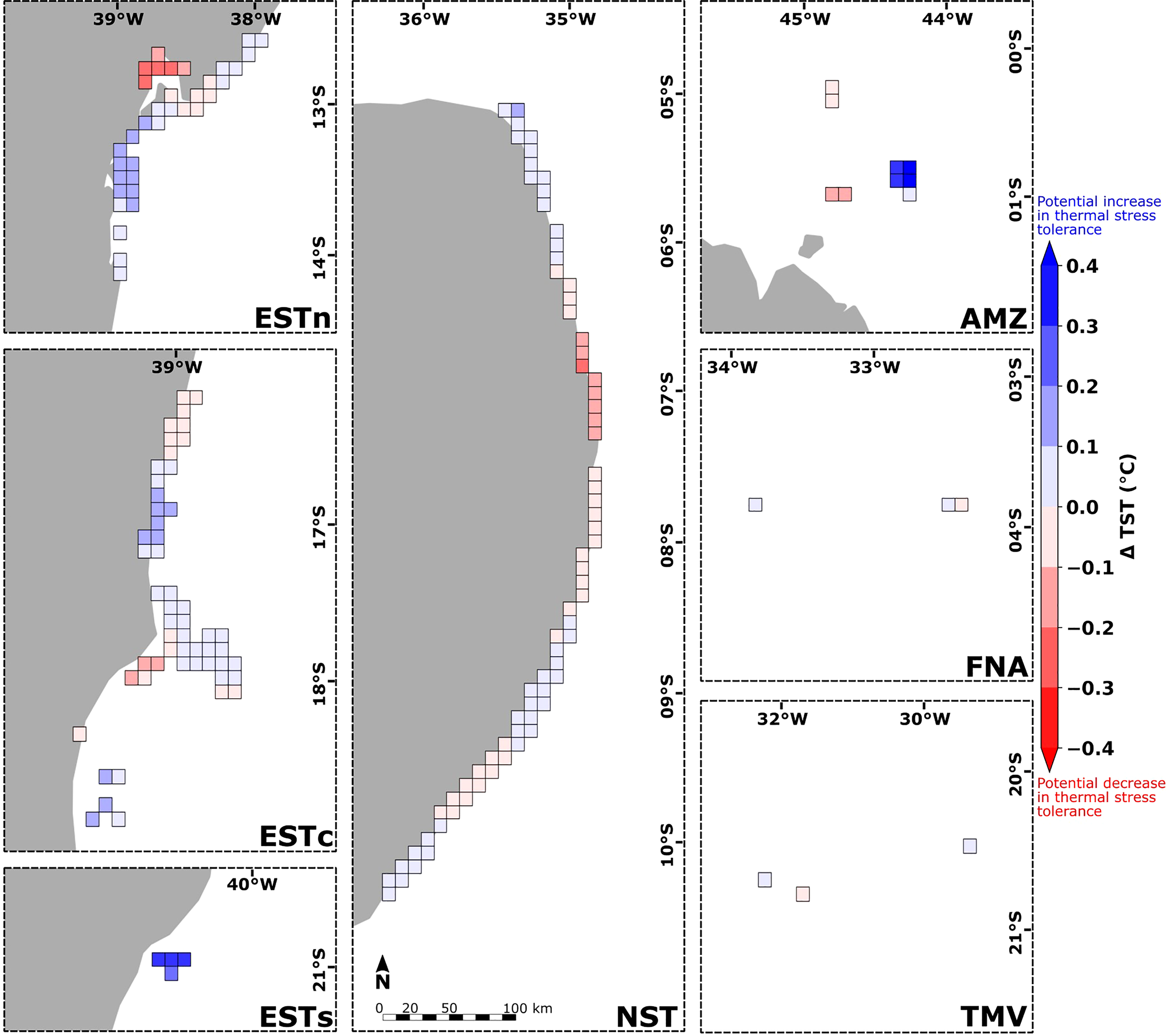 Spatial distribution of the difference between the thermal stress thresholds and connectivity-influenced TSTcp calculated for the 180 reef sites along the Brazilian continental margin (in gray). Blue and red colors indicate reef sites with potential increase and decrease in thermal stress tolerance, respectively. Ecoregions: Eastern-south (ESTs); Eastern-center (ESTc); Eastern-north (ESTn); Northeastern (NST), Amazon (AMZ), Fernando de Noronha-Atol das Rocas (FNA), Trindade-Martim Vaz Islands (TMV).