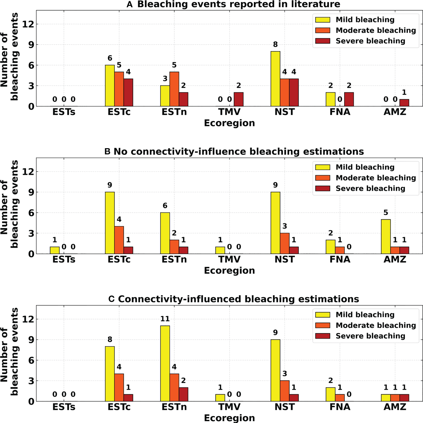 Number and severity of bleaching events for each ecoregion: (A) Bleaching events reported in the literature; (B) No connectivity-influence estimated bleaching events; (C) Connectivity-influenced estimated bleaching events. Ecoregions: Eastern-south (ESTs); Eastern-center (ESTc); Eastern-north (ESTn); Northeastern (NST), Amazon (AMZ), Fernando de Noronha-Atol das Rocas (FNA), Trindade-Martim Vaz Islands (TMV).