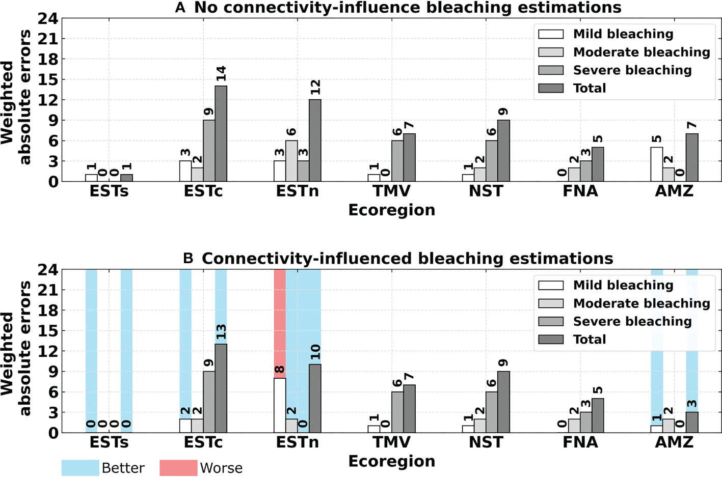 Absolute errors obtained for estimated bleaching events compared to reported bleaching events, as follows: (A) No connectivity-influence estimated bleaching events; (B) Connectivity-influenced estimated bleaching events. Values highlighted in blue and red indicate a better or worse bleaching estimate regarding the connectivity influence, respectively. Ecoregions: Eastern-south (ESTs); Eastern-center (ESTc); Eastern-north (ESTn); Northeastern (NST), Amazon (AMZ), Fernando de Noronha-Atol das Rocas (FNA), Trindade-Martim Vaz Islands (TMV).