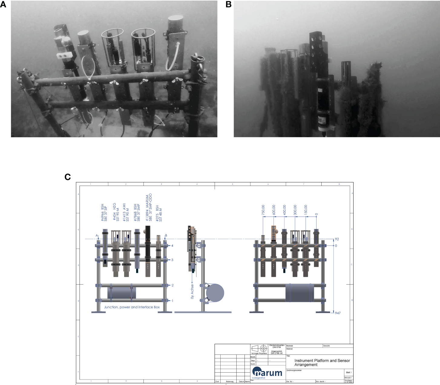 In situ images (upper panels A and B) and CAD drawing (lower panel C) with dimensions of the experimental setup of the deployed sensors. Upper left panel: Sensors immediately after deployment, Upper right panel: Sensors three month after deployment with one sensor (second from the right side) freshly lab-calibrated and maintained. For details see text.