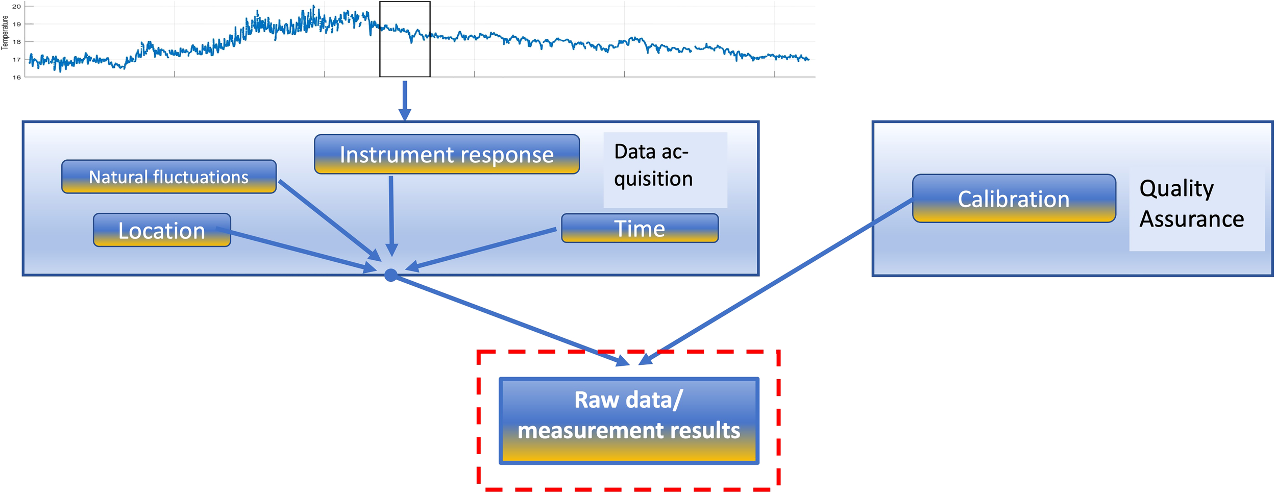 The values of the acquired signal are not only a result of the ocean parameter being measured, but it is also influenced by additional, external effects. It is affected by inevitable instabilities and inhomogeneities of the water body near the sensor during the acquisition of the signal. Furthermore, it is affected by the technical properties of the sensor, for instance, by the signal noise of the instrument or by sensor drift or bias. The latter are meant to be determined by a calibration measurement. However, the calibration measurement is likewise affected by the effects mentioned above. Consequently, even under excellent measurement conditions, using calibrated sensors and excluding any instrument or other failures, it is impossible to know to what degree the signal value deviates from the value that truly represent the ocean parameter being measured. Hence, the true value of the sensor signal is uncertain and a method to quantify the uncertainty must be defined to estimate a range around the signal value in which the true is lying with a specified probability. Figure 2 illustrates the complex input of information affecting measured raw data points.
