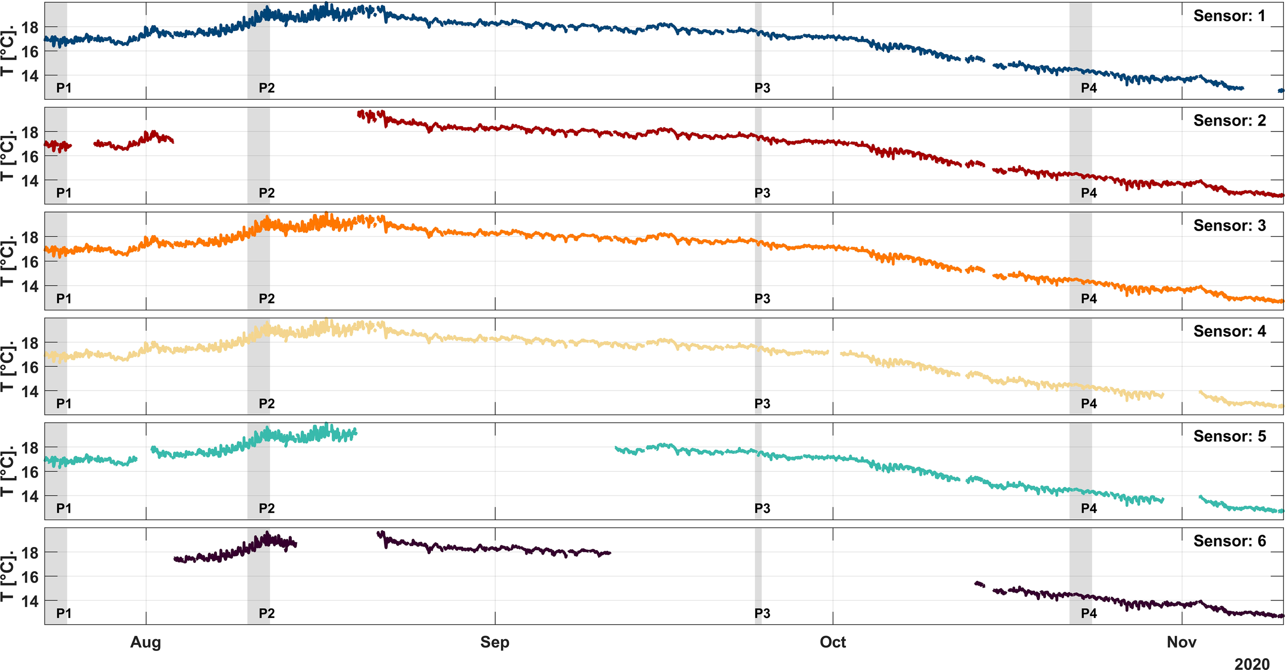 Measured temperature data of the six sensors for the whole measurement period (June 22 – Nov 10). Grey shaded areas indicate selected analysis periods. Unlabeled data gaps are due to different download speeds or caused by telemetry interruption.