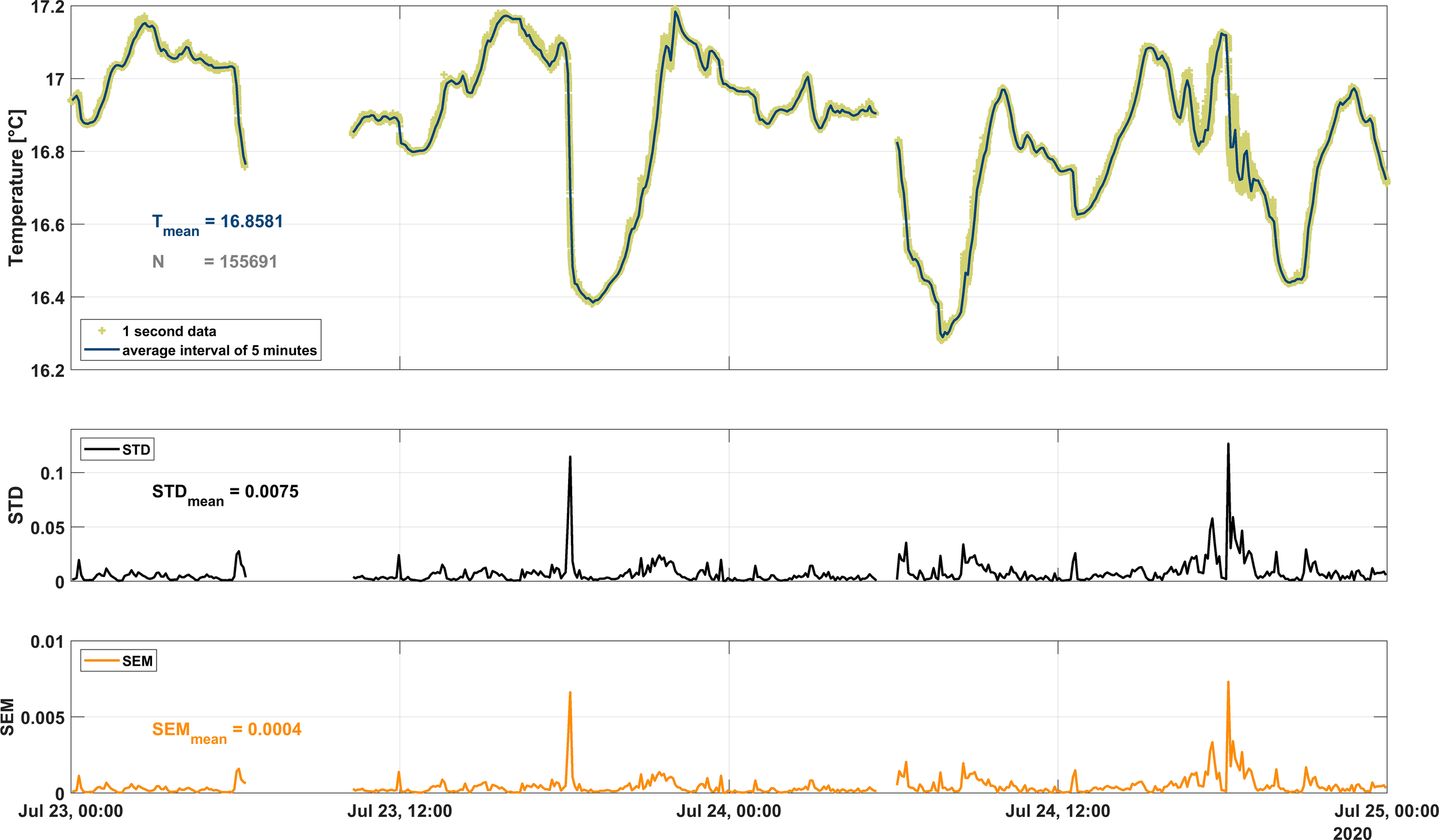 To get a more definite estimate of the variability and uncertainty of the different temperature measurements, statistical parameters (standard deviation and standard error of the sample mean) of each single sensor are determined. The standard deviation (STD) is derived from the temporal variations of the temperature signal and indicates the dispersion of the individual data samples relative to the sample mean over that selected time period. In contrast, the standard error of the mean (SEM) is a measure of the dispersion of the sample mean (further details in the following section). The SEM depends on both the STD and the sample size (N) through the relatively simple relationship