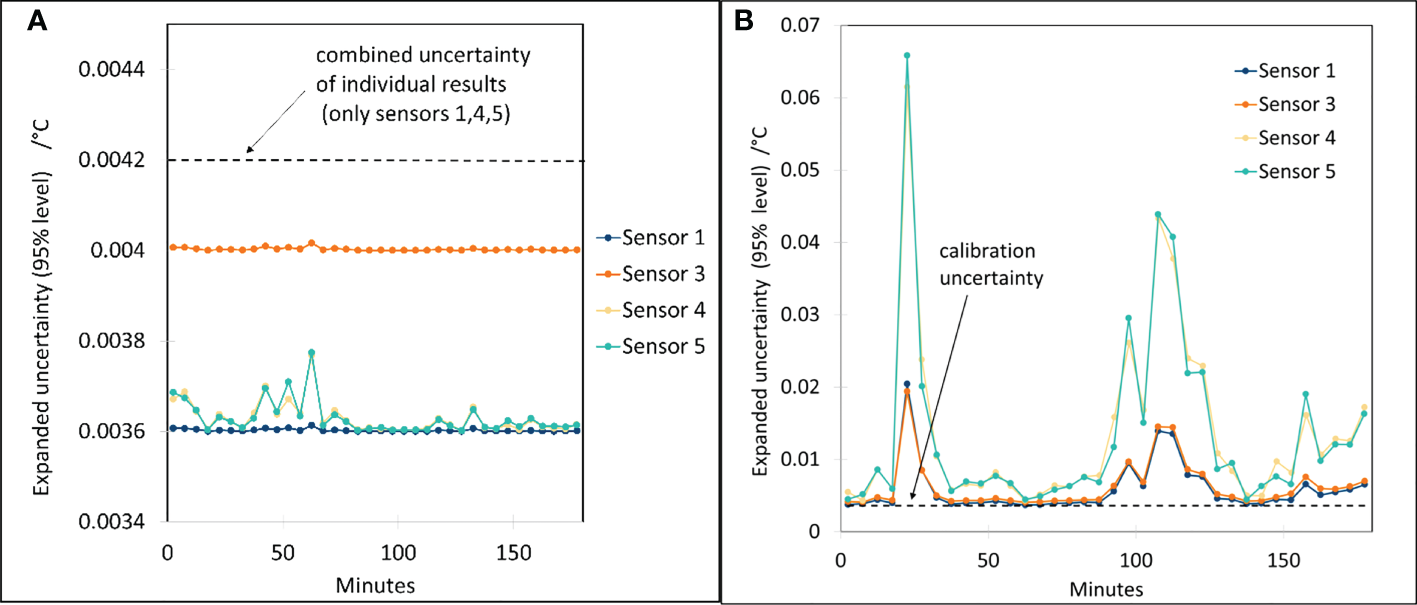 a) The combined uncertainty value of a result is in the order of the calibration uncertainty. Hence, fluctuation uncertainty is small compared to calibration uncertainty, as can be seen in the left-hand side of Figure 6. Temperature can be assumed stable and homogenous in the vicinity of the sensors. In this case, the uncertainties of all sensors will overlap quite well, as can be seen in the cloud on the left-hand side of Figure 7 (around 80 min). Each sensor measures a good estimate for the mean temperature and the combined uncertainty of the sensor result is a good estimate for the uncertainty of the temperature in the considered time window and measurement volume. The deviation of an individual sensor (e.g., that of sensor 5) from the mean cannot necessarily be considered as systematic measurement bias that should be compensated. In fact, the deviation lies in the range of the calibration uncertainty. Correcting results for deviations that are smaller than calibration uncertainty, cannot be justified.