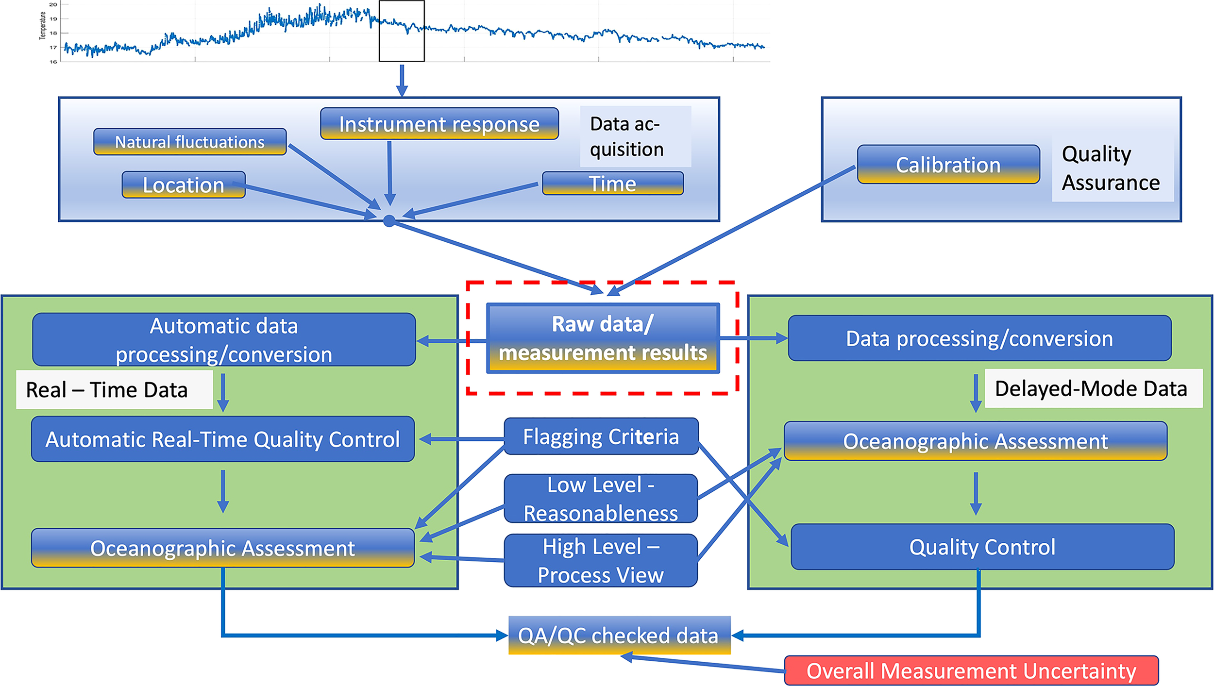 Schematic of information (blue) flow and their corresponding uncertainty (yellow) defining a single field measurement. The top part shows the environmental signal which is intended to be measured. The data acquisition box shows the different information and their uncertainty a measurement is facing: natural fluctuations of the environmental signal between the selected sampling interval, the sensor response capabilities, related measurement of time facing clock drift or data storage delays, uncertainty of location because of movement within the water column or if bottom mounted, change of water depth due to tidal effects. The quality assurance box is representing the information an uncertainty from the sensor calibration as detected in the laboratory under stable and well-known conditions.