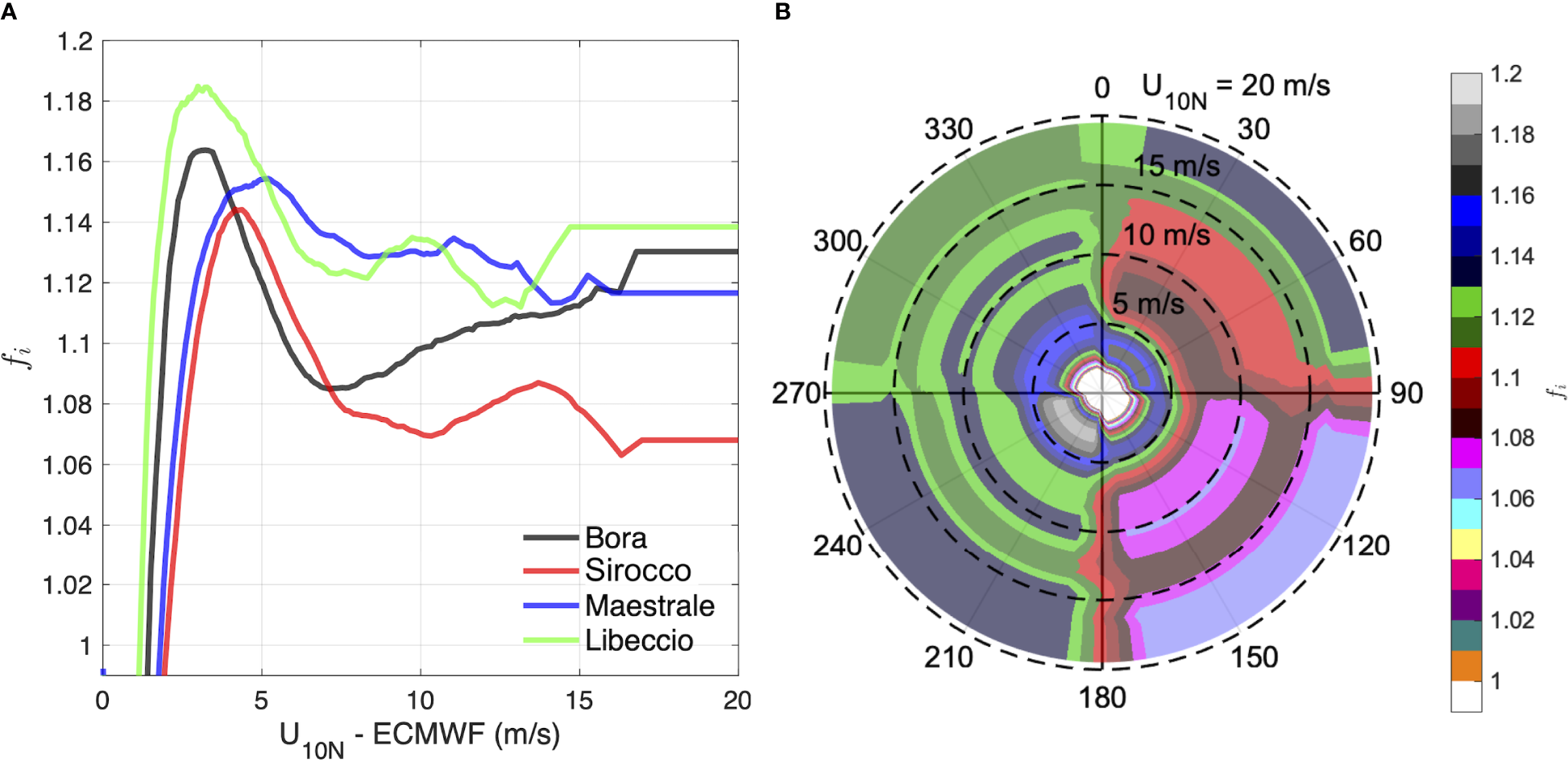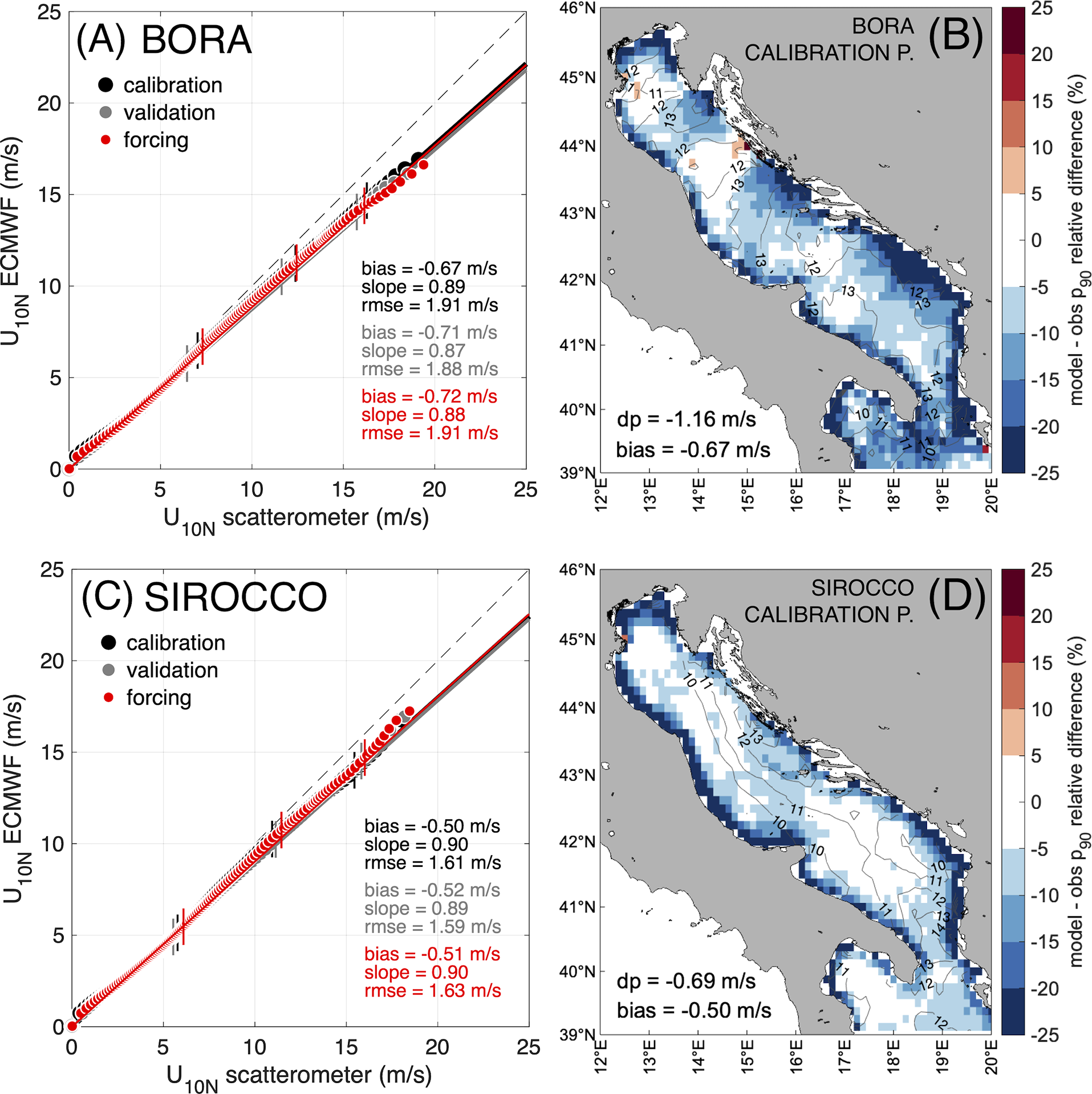 For Bora and Sirocco, the 90th percentile wind speed is in the m/s range; those winds would theoretically generate fully developed sea states of (with g gravitational acceleration; (Ochi, 2005)) in the m range. As this range almost completely falls within the m target of the study, we now focus on the wind speed regime responsible for such wave heights. Accordingly, the maps in Figures 2B, D show the spatial distribution of the relative difference of the model-observation 90th percentile wind speed, during the calibration period. The model underestimation is prevalent, especially close to the coasts, where the model wind speed can be down to -25% smaller than observations (see the "Discussions and conclusions" section for additional comments on this aspect). This is particularly evident in the northern Adriatic Sea, surrounded by coastlines on three sides. Offshore, the largest underestimation (down to -15%) is found in the regions where the strongest winds occur (see the contour lines in figures): (i) for Bora, in the wind jet regions in the east Adriatic (the northernmost one extending from the Gulf of Trieste towards the Gulf of Venice), (ii) for Sirocco, in the central Adriatic Sea. As a consequence, and particularly for Bora wind, the model-observation difference is characterised by a high spatial variability.