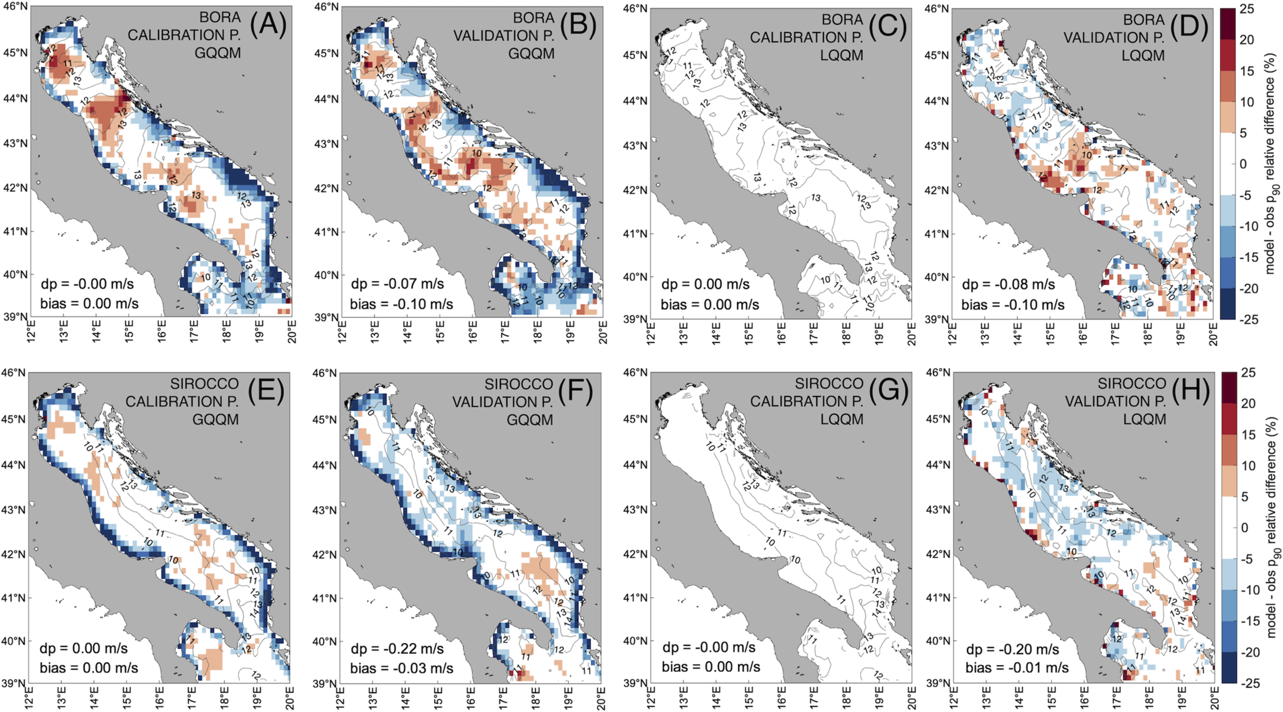 Comparison of wind forcing calibration strategies GQQM (A, B, E, F) and LQQM (C, D, G, H), during the calibration (A, C, E, G) and validation (B, D, F, H) periods, for Bora (A–D) and Sirocco (E–H). Model-observation 90th percentile relative difference (%) over the Adriatic and Ionian Seas. dp is the difference of the ensemble 90th percentile, bias is the mean model-observation difference of all the data. Contour lines are the observed wind speed 90th percentiles (m/s).