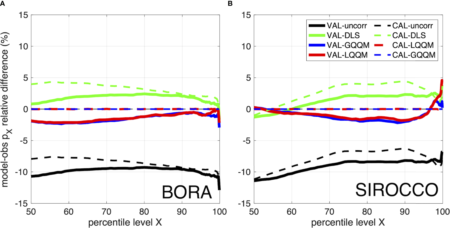 In Figure 3 the two correction strategies, GQQM and LQQM, are inter-compared during the wind calibration and validation periods, for Bora and Sirocco winds. The model-observation wind speed difference is shown as the relative difference of the local 90th percentile, highlighting the difference of the ensemble 90th percentile (dp) and the bias of all the data. Maps and comparative statistics for the calibration period (Figures 3A, C, E, G) aim at showing the effect of the quantile-specific bias correction on the calibration (including forcing) dataset, that is to abate the 90th percentile difference and bias to zero for both Bora and Sirocco: globally, in case of the GQQM, and both globally and locally, in case of the LQQM. Indeed, LQQM fully corrects the systematic error (Figures 3C, G), while with the GQQM some local differences remain on the basin (Figures 3A, E): a negative difference belt persists along the coastlines (although narrower and with smaller differences compared to the uncalibrated dataset), while offshore regions present an alternance of negative and positive difference areas, with zero difference in-between. In general, model-observation differences for Bora are larger than for Sirocco (however, smaller than 25% in absolute value) and smaller where the wind speed is larger (see the contour lines in figures). For Bora, zero or negative difference occurs in the wind jet regions, with positive difference in-between the jets. For Sirocco, differences are mostly zero or slightly positive/negative, without a clear pattern. Thus, correction has been particularly effective in those offshore areas that presented the largest model underestimations (see Figures 2B, D).