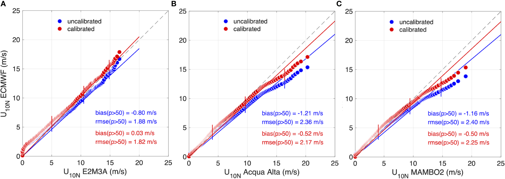 The neutral wind speeds derived from scatterometer observations and forecasted by the IFS model are assessed in Figure 2 for the two winds that mostly contribute to the sea state generation in the northern Adriatic Sea, namely the northeasterly Bora and the southeasterly Sirocco. Indeed, we have classified the winds in the Adriatic Sea according to their (coming from) direction : Bora (1st quadrant, ), Sirocco (2nd quadrant, ), Libeccio (3rd quadrant, ), Maestrale (4th quadrant, 27). The statistics for the three periods considered are presented, but we discuss only those related to the calibration period (in black color), as differences are rather small (especially between calibration and forcing datasets), with the largest ones emerging for wind speed percentiles beyond the 99th. The Quantile-Quantile (QQ) plots in Figures 2A, C confirm the systematic underestimation of the model wind speed, with emerging differences between the two wind directions. The best-fit line slope is always smaller than 1 (the largest one is 0.90 for Sirocco) and the bias ranges from -0.50 m/s (Sirocco) to -0.67 m/s (Bora). The random error (root mean square error, rmse) is the largest for Bora (1.91 m/s) and the smallest for Sirocco (1.61 m/s), the latter overall resulting in the best modelled wind among the four directions, with the smallest systematic and random errors (Libeccio and Maestrale not shown here). The vertical bars represent the 50th, 90th and 99th percentiles of the wind speed datasets. The model-observation ratios of the three percentiles are, respectively 0.92, 0.91, 0.90 for Bora, and 0.89, 0.94, 0.91 for Sirocco, pointing out a small but not negligible variation of the model performance over the wind regimes, in particular for Sirocco.