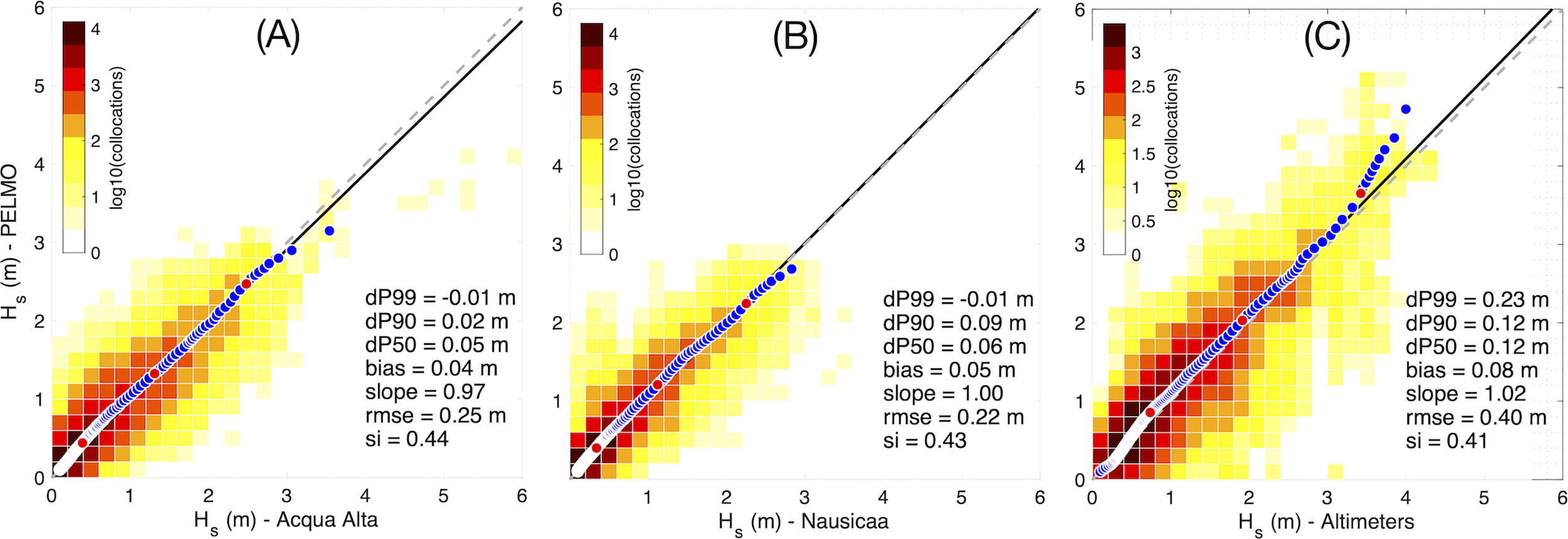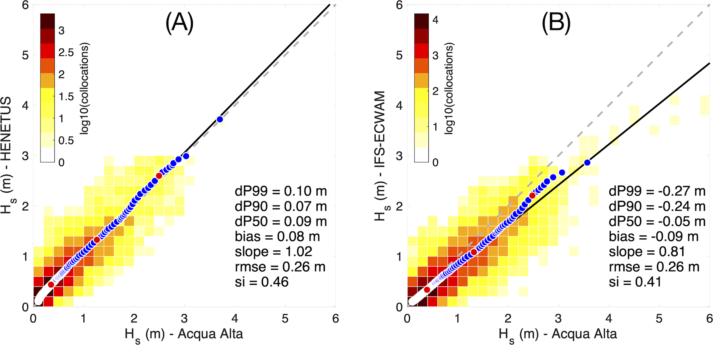 b. co-location of the forecast values Hs at “Acqua Alta” with respect to observations .