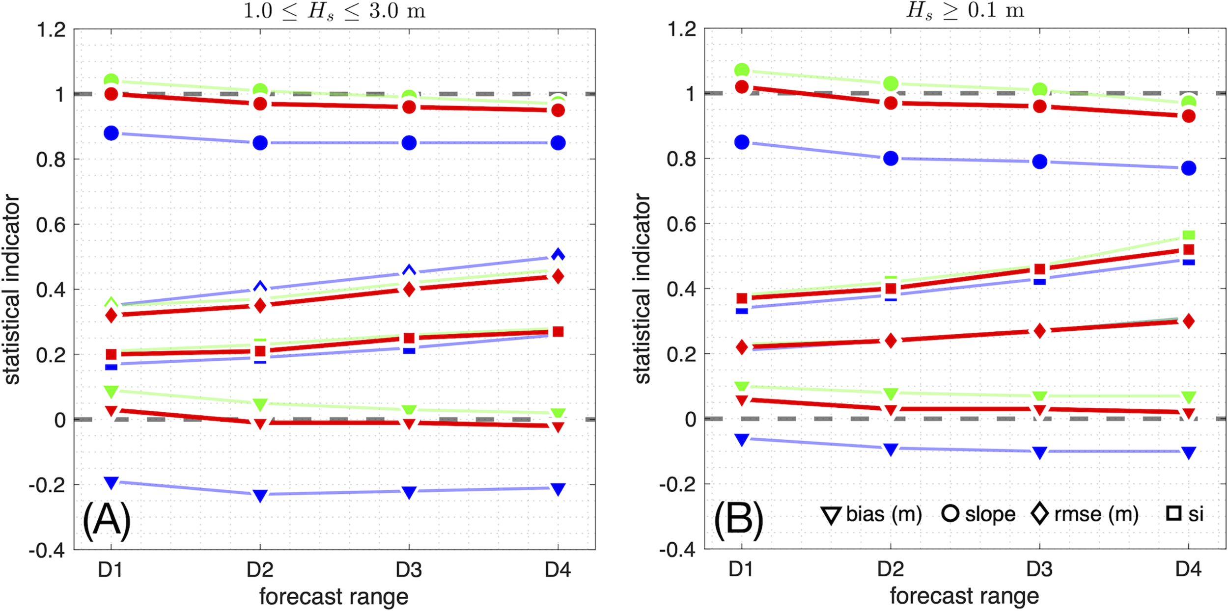 The wave forecasts (00UTC and 12UTC synoptic hour runs, leadtime from +1 to +48 hours) are forced with the calibrated wind speeds (Table 2) and the period that was chosen for calibration is 01/01/2019-30/06/2019, 6 months entailing winter and spring seasons and comprising 738 sea states at “Acqua Alta” with m. Each forecast is initialised with the leadtime +13 wave field of the previous forecast, which corresponds to leadtime +1 (i.e., the initial conditions) of the current forecast (the first neutral wind field is at leadtime +1 since no analysis is produced). The choice of using the first 48 hours of the forecast for the calibration (instead of the available 90 hours) meets the request to optimise the forecast on the first two days, i.e., those characterised by the most accurate forecast winds. As the nearest grid node to the “Acqua Alta” platform (12.50°E, 45.33°N) in the wave model has a water depth of 18.28 m (instead of the actual 17 m) we have verified that the results obtained at 18.28 m are comparable with those obtained in the same position but with a depth of 17 m.