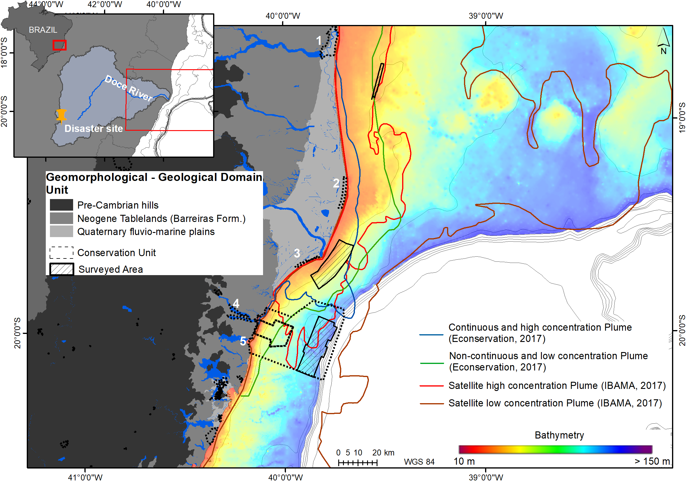Bathymetric map (grid spacing of 100 m) of the study area showing: surveyed habitat mapping areas; distribution of Conservation Units (1- Marine Protected Area Conceição da Barra; 2 - Degredo Area of Relevant Ecological Interest; 3 - Biological Reserve of Comboios; 4- Municipal Sustainable Development Reserve (RDS) Piraquê-açu and Piraquê-Mirim; 5 - Wildlife Reserve Santa Cruz/Marine Protected Area Costa das Algas; and compilations of the maximum riverine plume contour based on direct helicopter observation (Econservation, 2017) and satellite image (IBAMA (Instituto Brasileiro do Meio Ambiente e dos Recursos Naturais Renováveis), 2017) for the first two years after the dam failure.