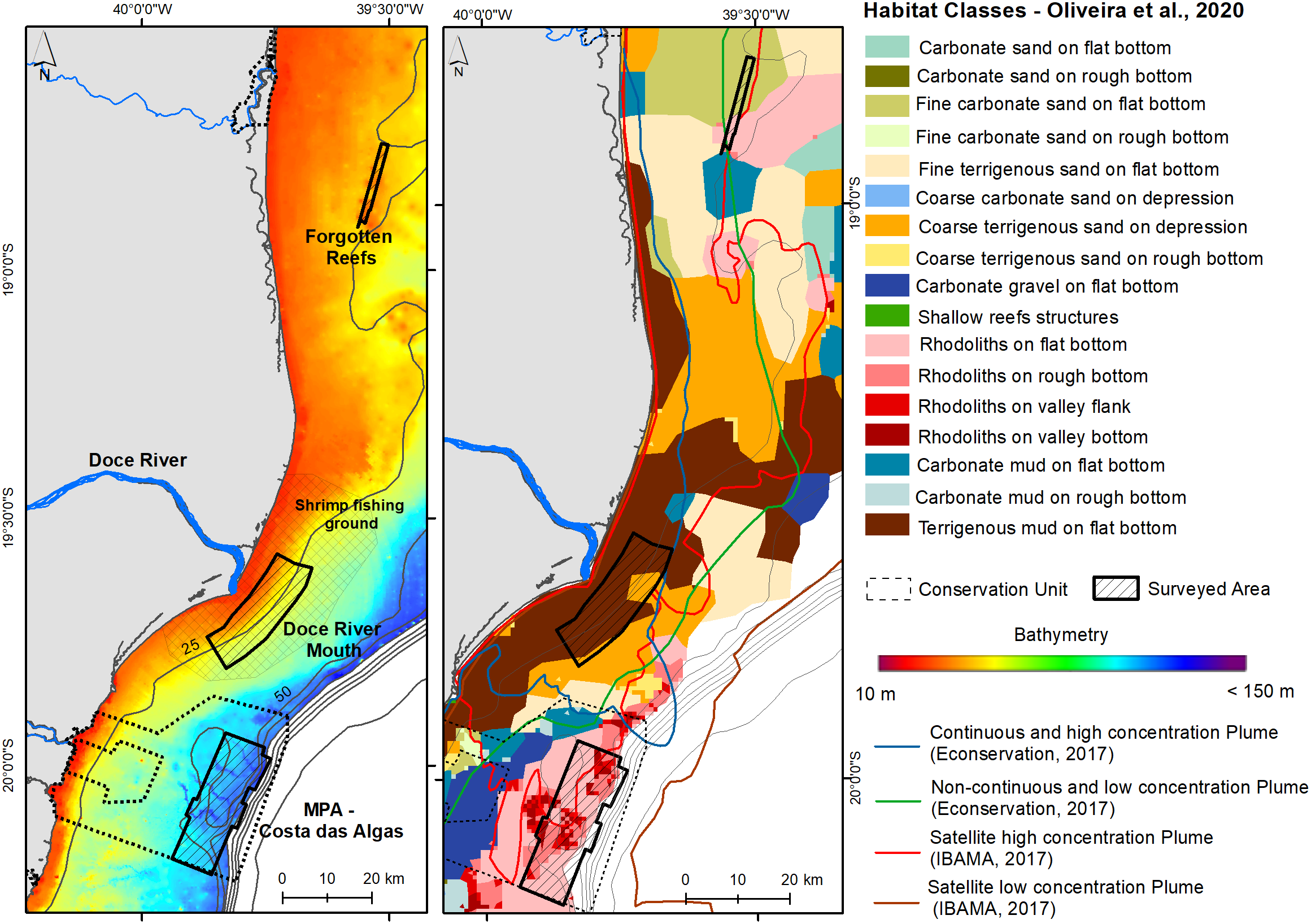 The Forgotten Reefs are located around 60km northward from the river mouth and are part of the Abrolhos Shelf. The occurrence of these reefs was only known by local fisherman, so there is very little knowledge about this reef area, with a medium to long-term potential tailing influence due to net riverine sediment transport northward. These reefs were first acoustically mapped by Vieira et al. (2019) and very little was known about them when the dam collapse occurred. Moreover, the northern Abrolhos shelf comprises the largest coralline reefs in the South Atlantic, where is located the Abrolhos National Marine Park, a no-take MPA.