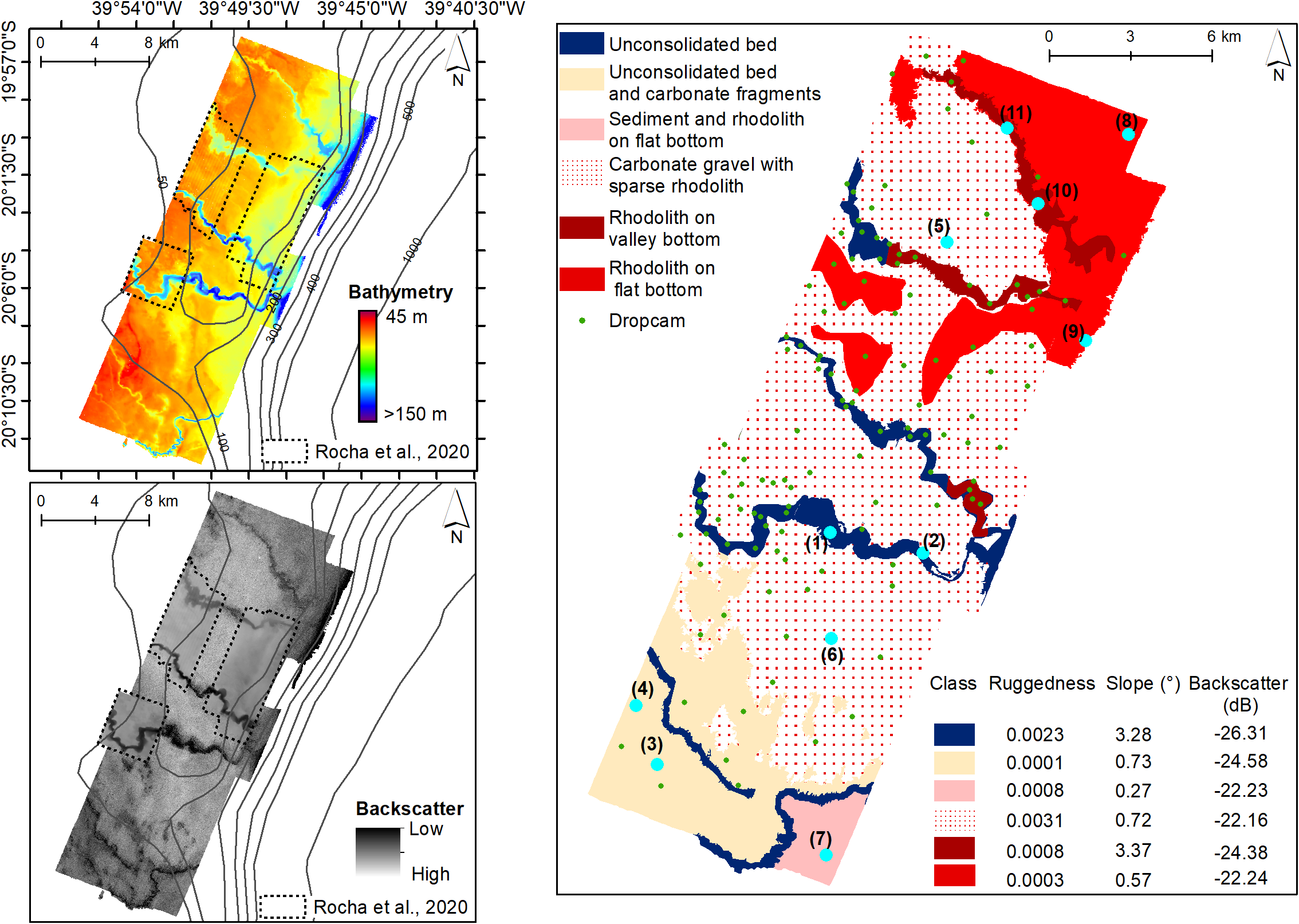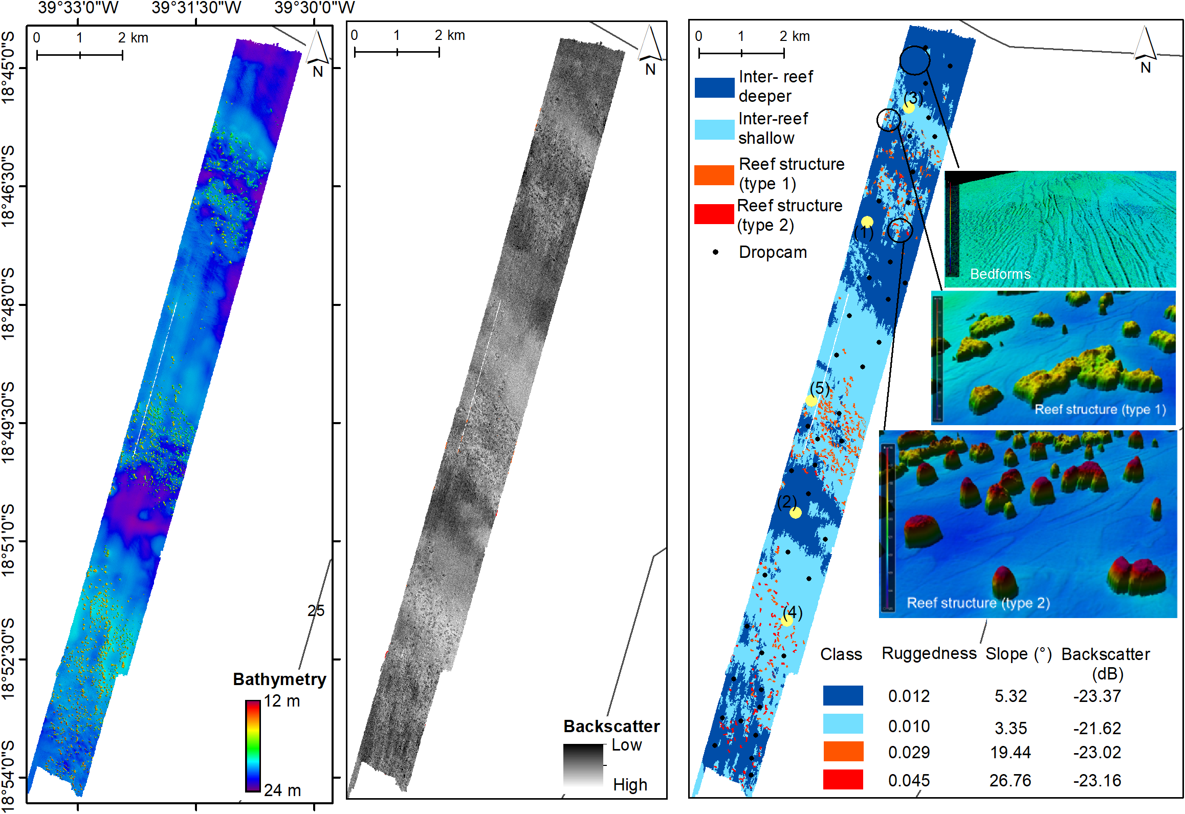 The classification tool defined two types of reef seascapes based on the rugosity and reef top depth. The southern reefs range from 13 to 15 m depth and the northern ones from 18 to 20 m depth. Two inter-reef classes were defined and are marked by a gravel-sand class, and were differentiated mostly according to depth range and backscatter intensity (coherent with what was seen in the drop images 3 and 4 located in regions shallower than and 1 and 2 - depicting a seabed with coarse sediment and carbonate fragments).