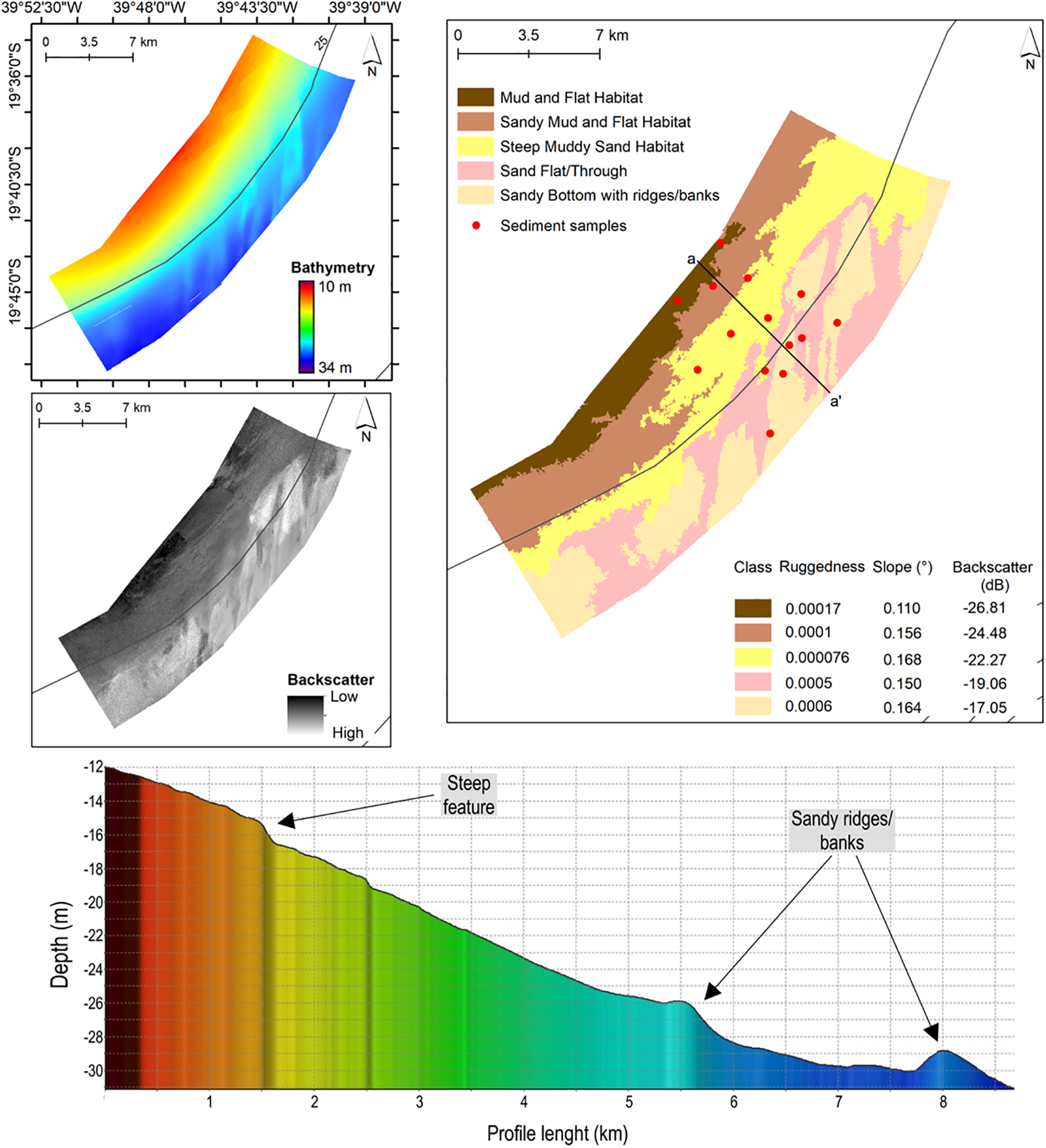 Doce river mouth site - top left bathymetric map (resolution of 2 m), bottom left backscatter intensity map (resolution of 2 m), on the right is the potential habitat classification map (resolution of 20 m) with the table originated from each class, and below the bathymetric profile indicating features.