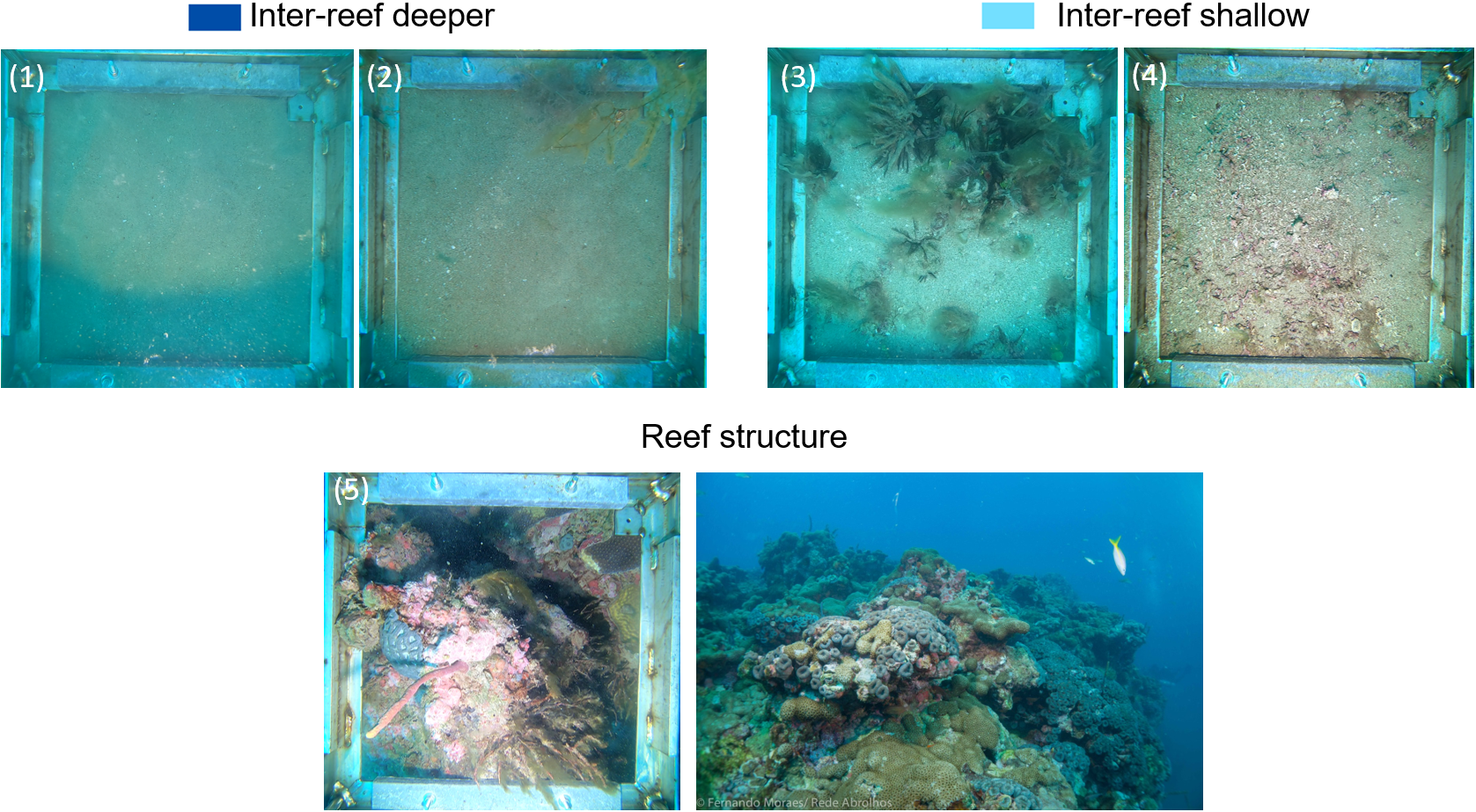 Drop Cameras images from the Forgotten Reefs site, numbering according to the light blue dots in Figure 9. Panoramic view image courtesy of Rede Abrolhos.
