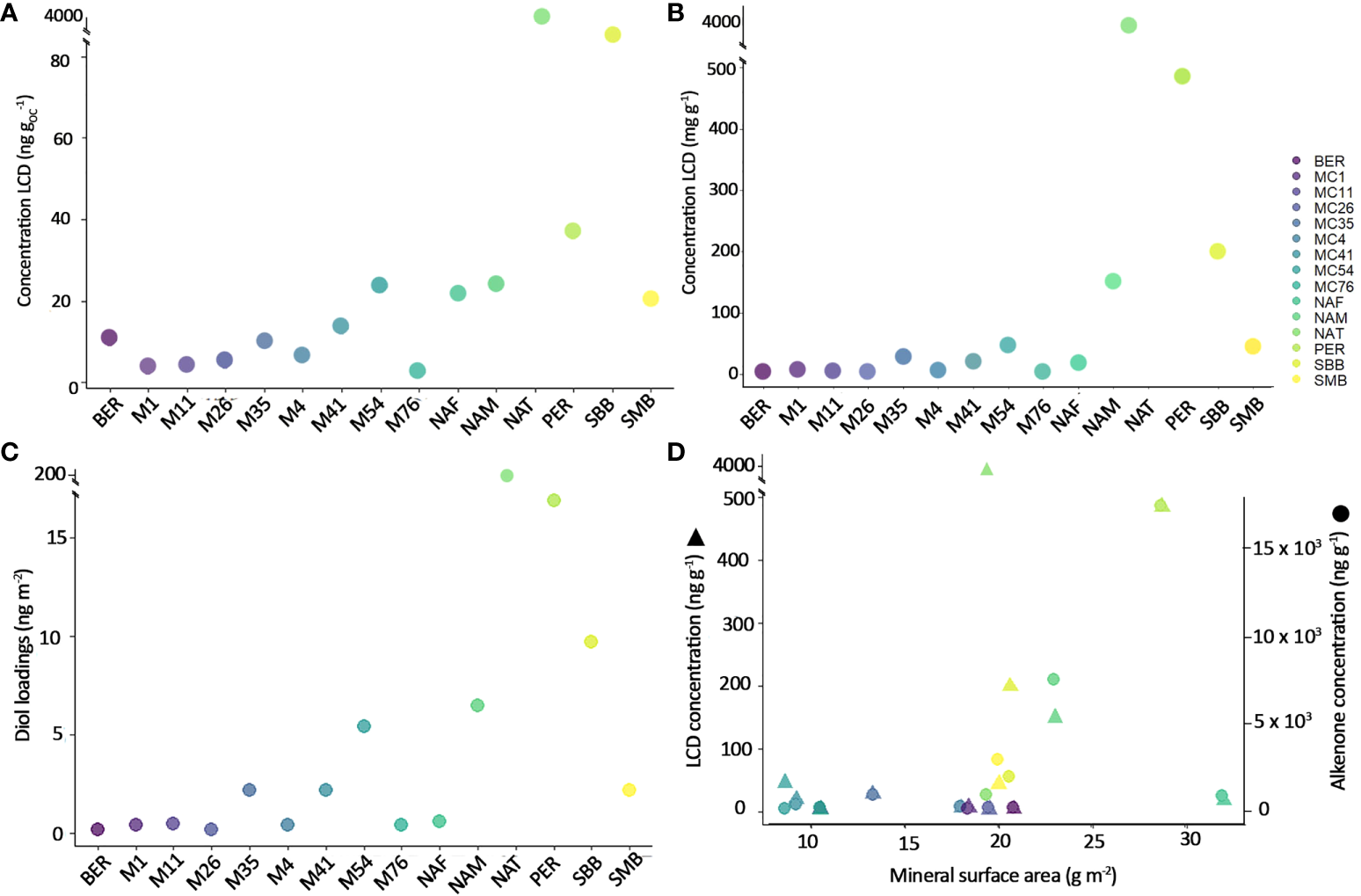 Figure 2 Total LCD concentration in bulk sediments (A) OC-normalized and (B) mass-normalized (C) LCD loadings and (D) LCD and alkenone concentration (ng g-1) in relation with mineral surface area (alkenone concentrations from Ausín et al., 2021).
